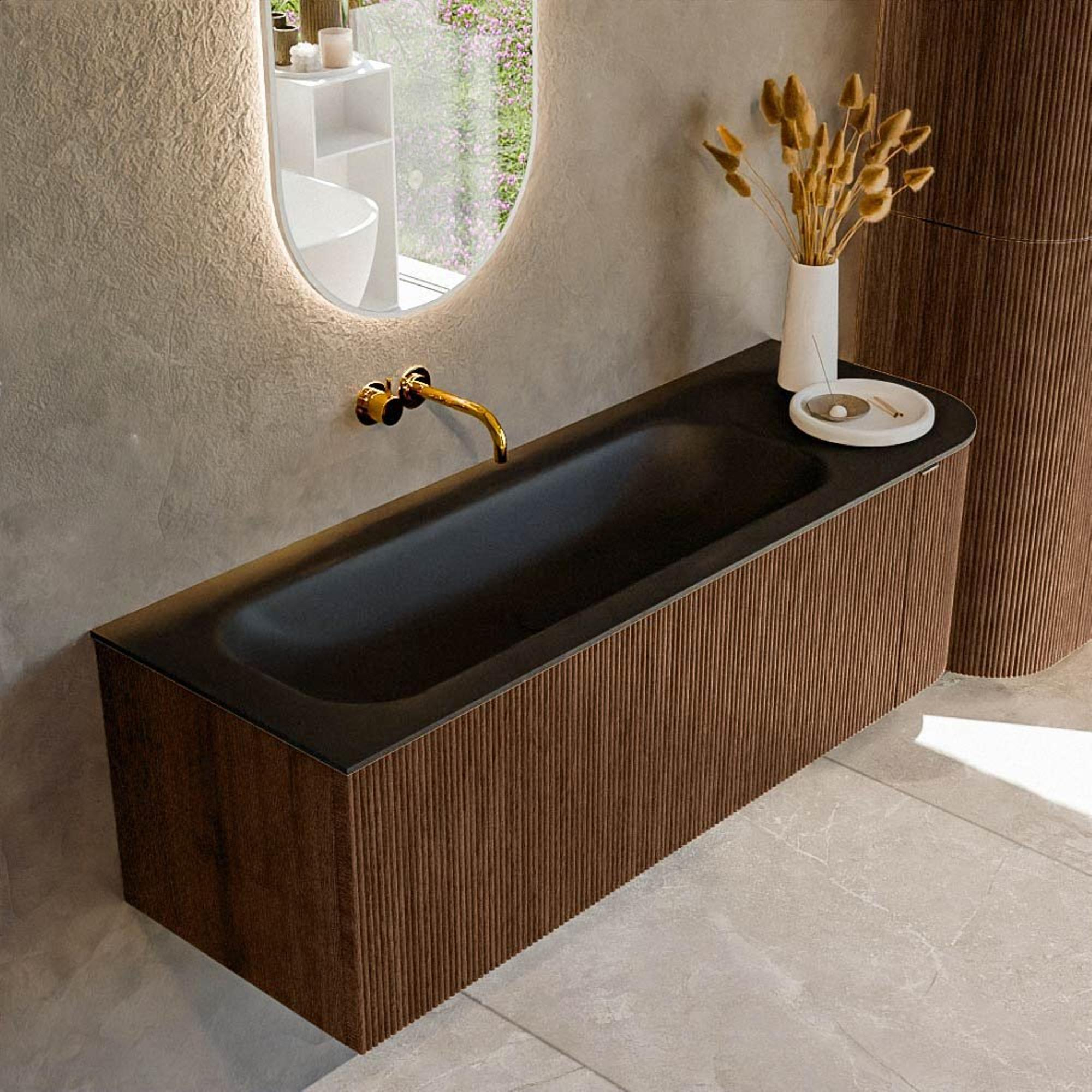 La forme rectangulaire aux angles arrondis confère à ce meuble une apparence douce et conviviale, tandis que la couleur walnut mate constitue une base chaude et naturelle dans votre salle de bains. La structure bois se marie parfaitement avec des styles populaires comme le moderne, l'industriel et le Japandi, surtout en combinaison avec la couleur urban du plan et le lavabo noir. Comme le meuble est suspendu au mur, le sol reste dégagé et l'espace paraît plus grand et plus aéré – idéal si votre salle de bains n'est pas très grande ou si vous souhaitez un look épuré et ordonné. La poignée intégrée dans la façade et la porte crée un ensemble minimaliste sans poignées saillantes, ce qui rend le design à la fois sobre, intemporel et agréable à utiliser au quotidien.