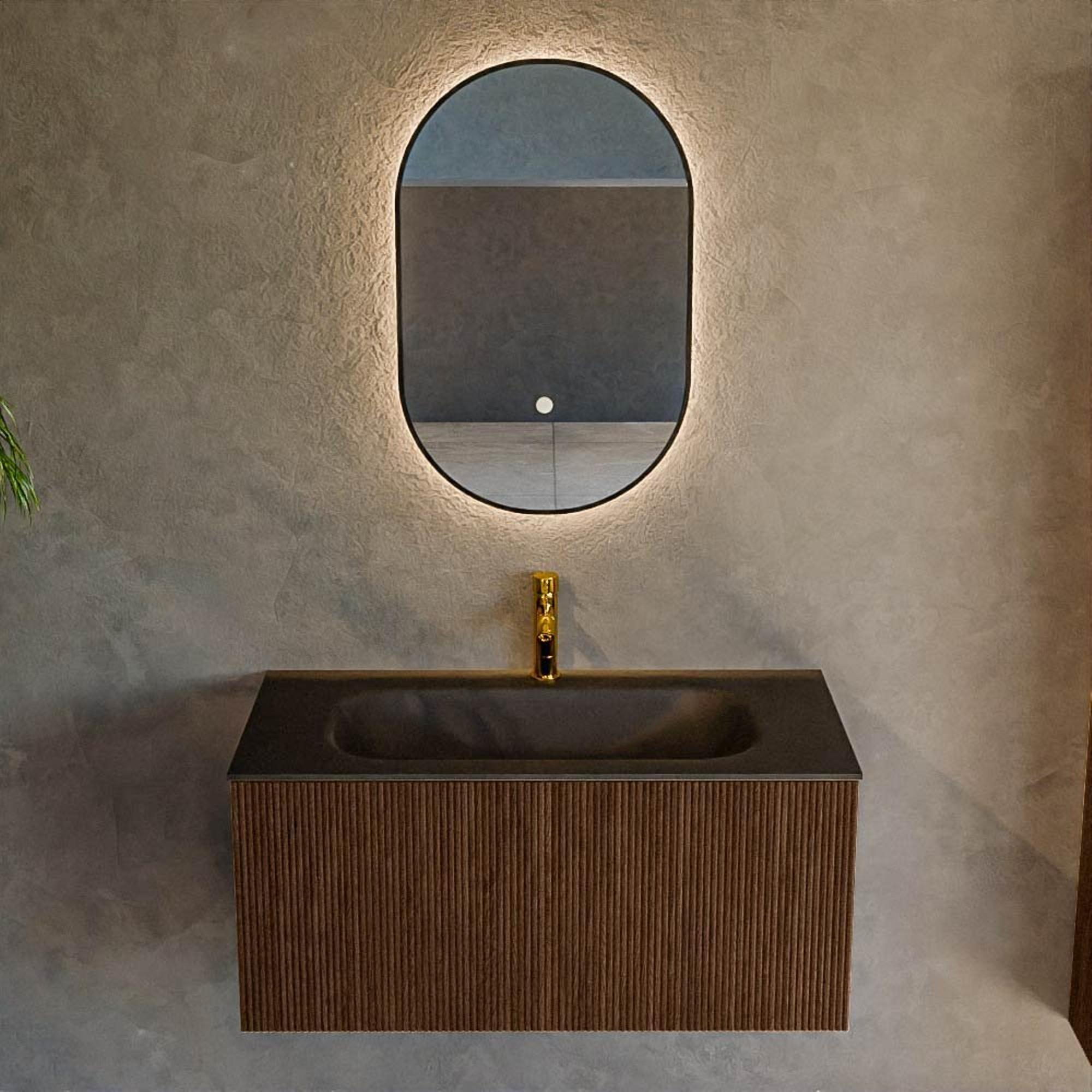 Vous recherchez un meuble de salle de bains luxueux qui combine chaleur, design et facilité d’utilisation, mais vous n’avez pas l’espace (ou le besoin) pour une composition imposante ? Ce meuble mural compact de 90 cm de large est alors un choix malin. Avec sa forme droite et épurée et son aspect bois chaleureux, il s’intègre parfaitement dans les salles de bains modernes et scandinaves, mais aussi dans un intérieur plus hôtel-chic. La combinaison du meuble walnut avec le lavabo noir épuré crée un contraste élégant qui donne immédiatement plus de caractère à votre salle de bains. Grâce au montage flottant, votre espace paraît en outre plus grand et le sol reste libre, ce qui est idéal dans les salles de bains de taille moyenne et plus petites. L’agencement pratique avec un grand tiroir et un lavabo central avec trou de robinet permet une utilisation quotidienne confortable et organisée de votre meuble vasque, sans que l’ensemble ne paraisse chargé ou désordonné.