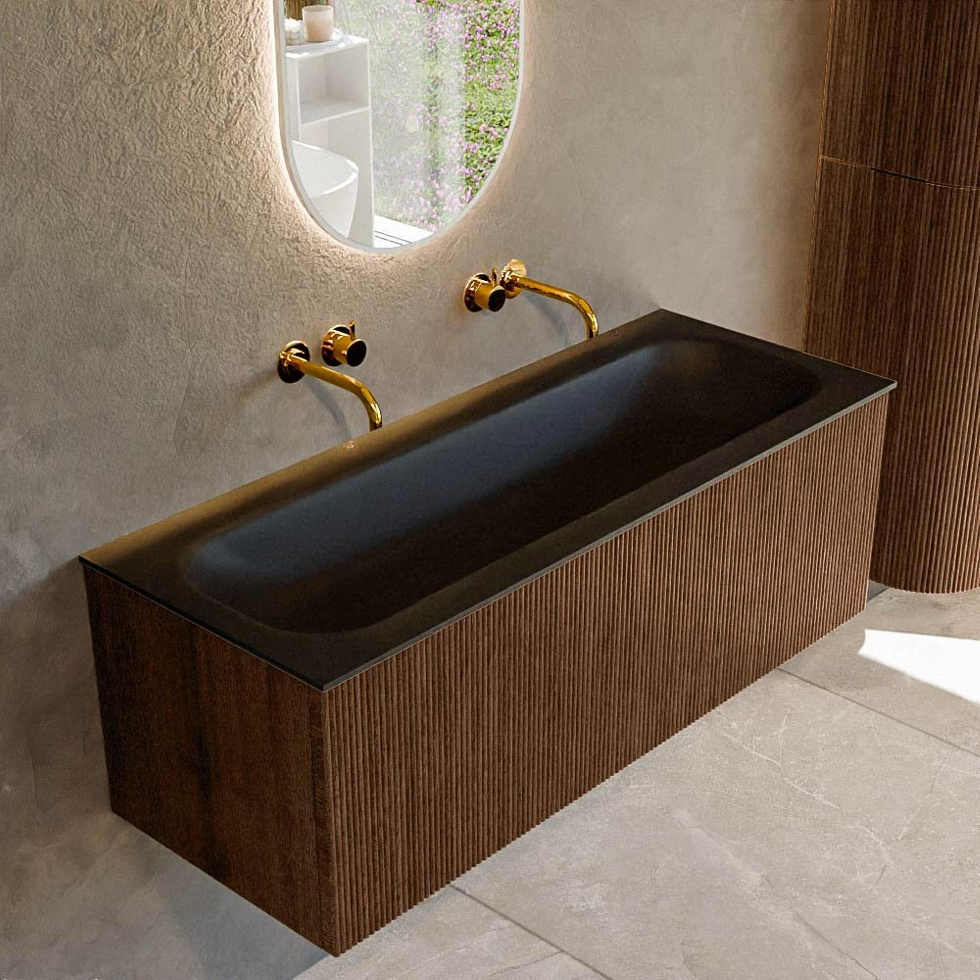 Si vous recherchez un meuble de salle de bains à la fois élégant et pratique pour une salle de bains moderne ou luxueuse, alors cette combinaison épurée d’effet bois et de noir est un très bon choix. Avec sa largeur généreuse de 120 cm et son grand lavabo positionné au centre, il offre amplement d’espace pour un usage quotidien, sans que votre salle de bains ne paraisse désordonnée. Grâce à la fixation murale, le meuble semble flotter, ce qui est idéal si vous souhaitez créer une atmosphère spacieuse de type hôtel, même dans une salle de bains de taille moyenne. L’association de la teinte chaleureuse Walnut avec le plan Urban épuré et le lavabo noir s’accorde parfaitement avec les tendances actuelles, comme les salles de bains de style industriel, moderne ou scandinave. Ce meuble convient particulièrement si vous aimez une apparence ordonnée, des rangements astucieux et un look minimaliste sans poignées visibles ni trous de robinet dans le plan.