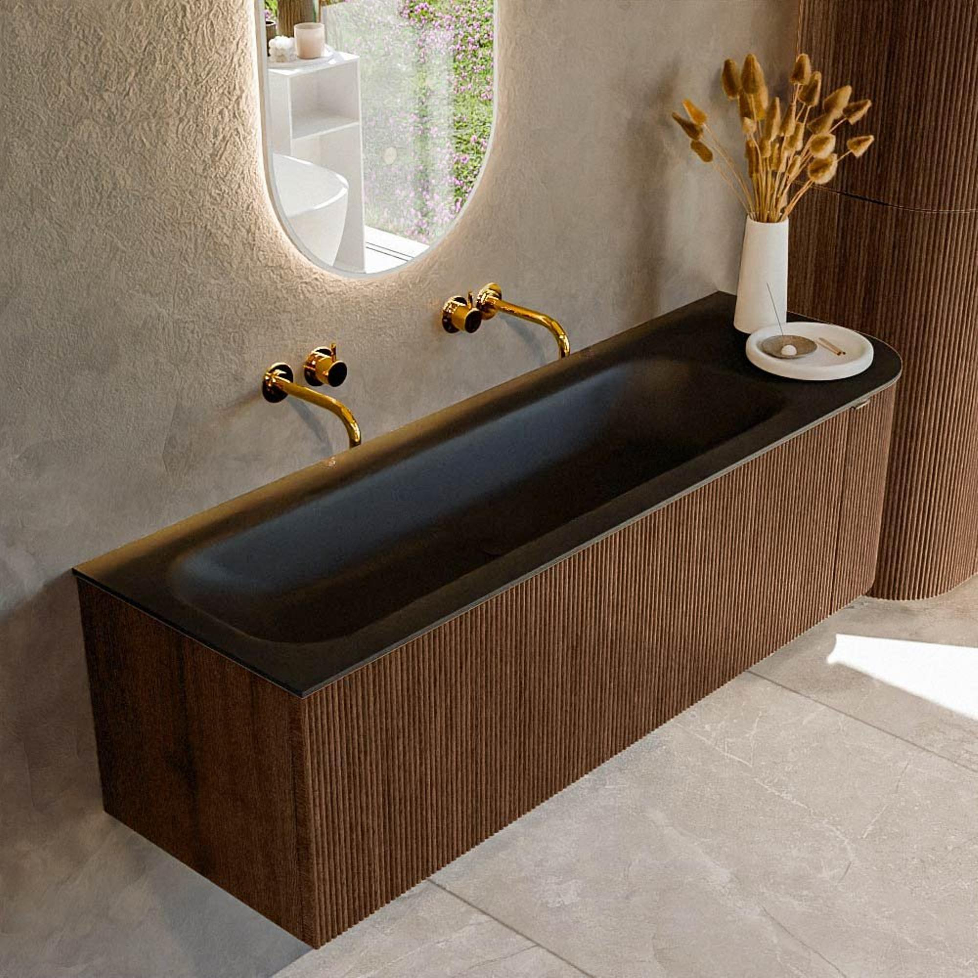 La combinaison de la couleur walnut mat avec le lavabo noir crée un look luxueux et contemporain qui s’harmonise parfaitement avec les salles de bains modernes et industrielles. Les façades et les côtés sont réalisés en bois de qualité avec une teinte chaleureuse, ce qui apporte immédiatement une atmosphère conviviale et naturelle à la pièce. La forme rectangulaire aux angles arrondis adoucit les lignes de votre salle de bains et offre un design accueillant et haut de gamme qui rappelle les hôtels et spas de luxe. Le lavabo noir mat Urban forme un contraste marqué avec le bois chaleureux et met particulièrement en valeur les robinets et accessoires noirs, gunmetal ou en métal brossé. En l’absence de trou de robinet, vous avez en outre toute liberté de choisir un élégant mitigeur surélevé avec robinetterie encastrée ou sur plan, en parfaite adéquation avec vos goûts personnels et le reste de votre sanitaire.