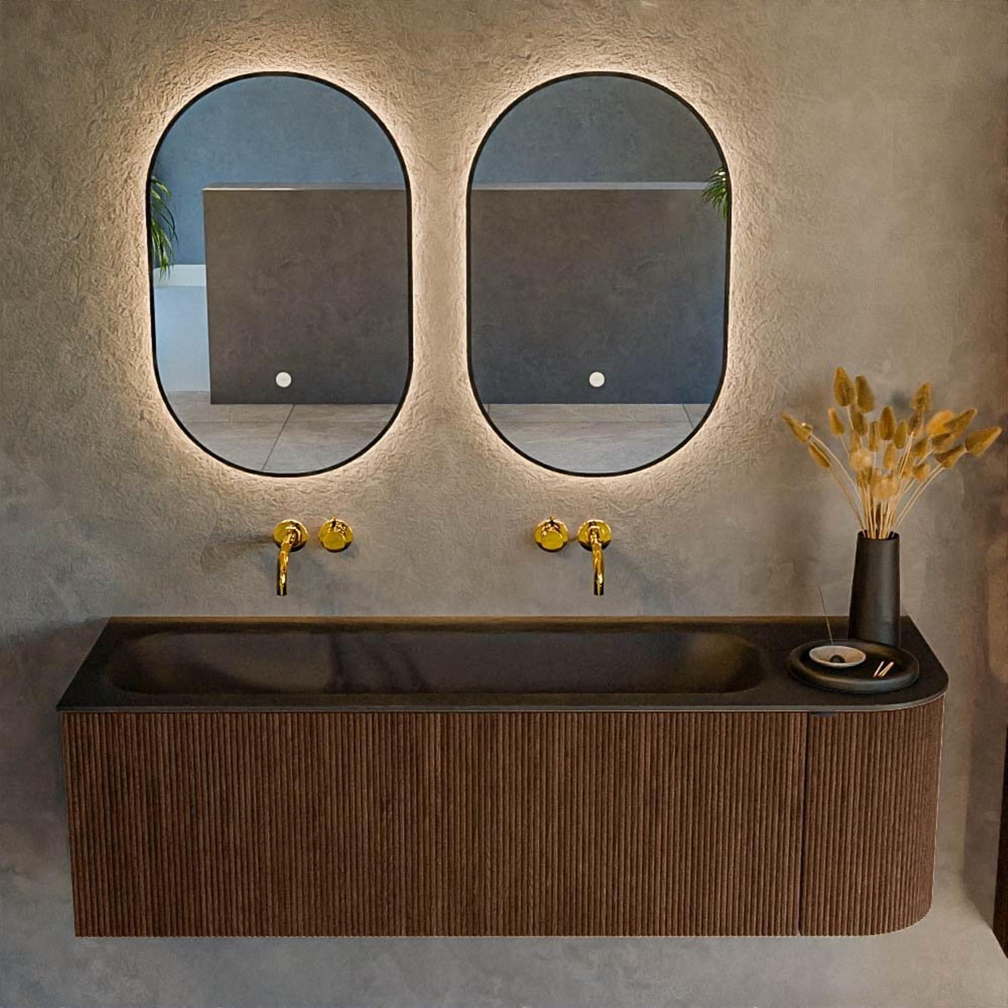 - Aspect bois walnut mat pour une atmosphère chaleureuse et naturelle qui s’intègre parfaitement dans les salles de bains modernes et industrielles.