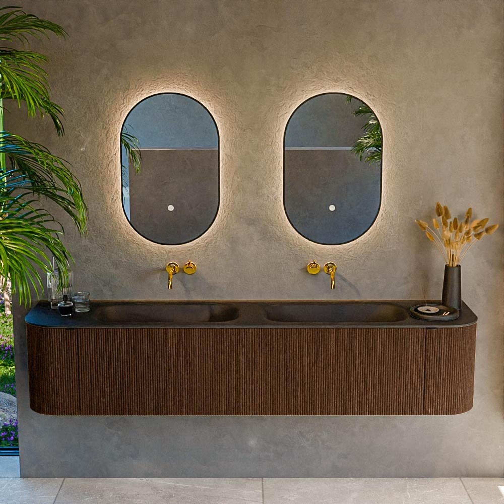 La combinaison d'un meuble walnut mat avec un lavabo Urban noir donne immédiatement à votre salle de bains une apparence haut de gamme, presque digne d'un hôtel. L'aspect bois dans une chaude teinte noyer apporte ambiance et convivialité, tandis que le lavabo noir mat ajoute au contraire une touche moderne et forte. La forme rectangulaire aux angles arrondis paraît douce et accueillante, tout en restant très épurée et contemporaine. Cela rend ce meuble particulièrement adapté comme véritable accroche-regard dans une salle de bains moderne ou industrielle, mais il trouve également parfaitement sa place dans un style calme et naturel avec beaucoup de bois et de carreaux clairs. Comme le plan et le lavabo sont réalisés en un seul ensemble et sans trous de robinet, on obtient un aspect sobre et sans joint qui se combine parfaitement avec des robinets encastrés modernes sortant du mur ou posés sur le plan.