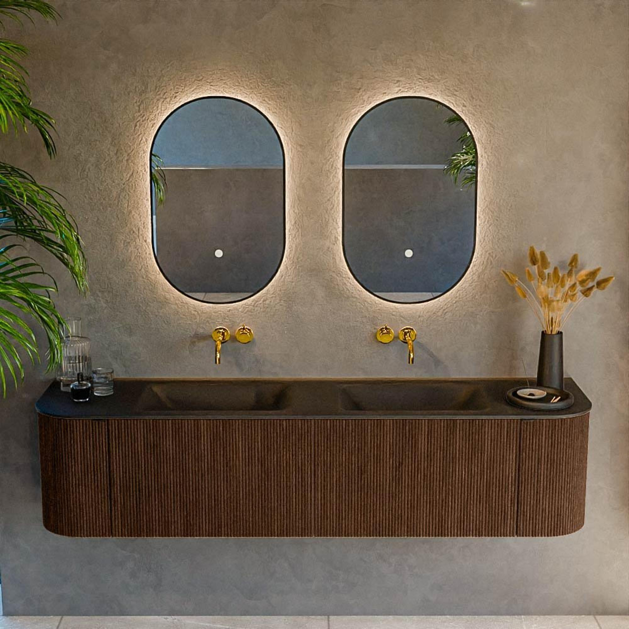 Le plan vasque double intégré rend vos routines du matin et du soir beaucoup plus détendues. Comme il y a deux lavabos, vous pouvez facilement vous brosser les dents, vous maquiller ou vous raser en même temps, sans vous gêner. Le plan vasque est réalisé sans trous de robinet, ce qui vous laisse toute liberté pour choisir des robinets sur gorge assortis ou un robinet encastré dans le mur. Vous adaptez ainsi exactement l’apparence à votre style, du minimalisme épuré au style industriel affirmé. La forme rectangulaire aux angles arrondis est à la fois moderne et douce, ce qui s’accorde parfaitement avec un aménagement de salle de bains contemporain. La couleur sombre du double lavabo crée en outre un contraste élégant avec le meuble chaleureux et est idéale si vous aimez une base luxueuse et apaisante que vous pouvez ensuite enrichir avec des accessoires.