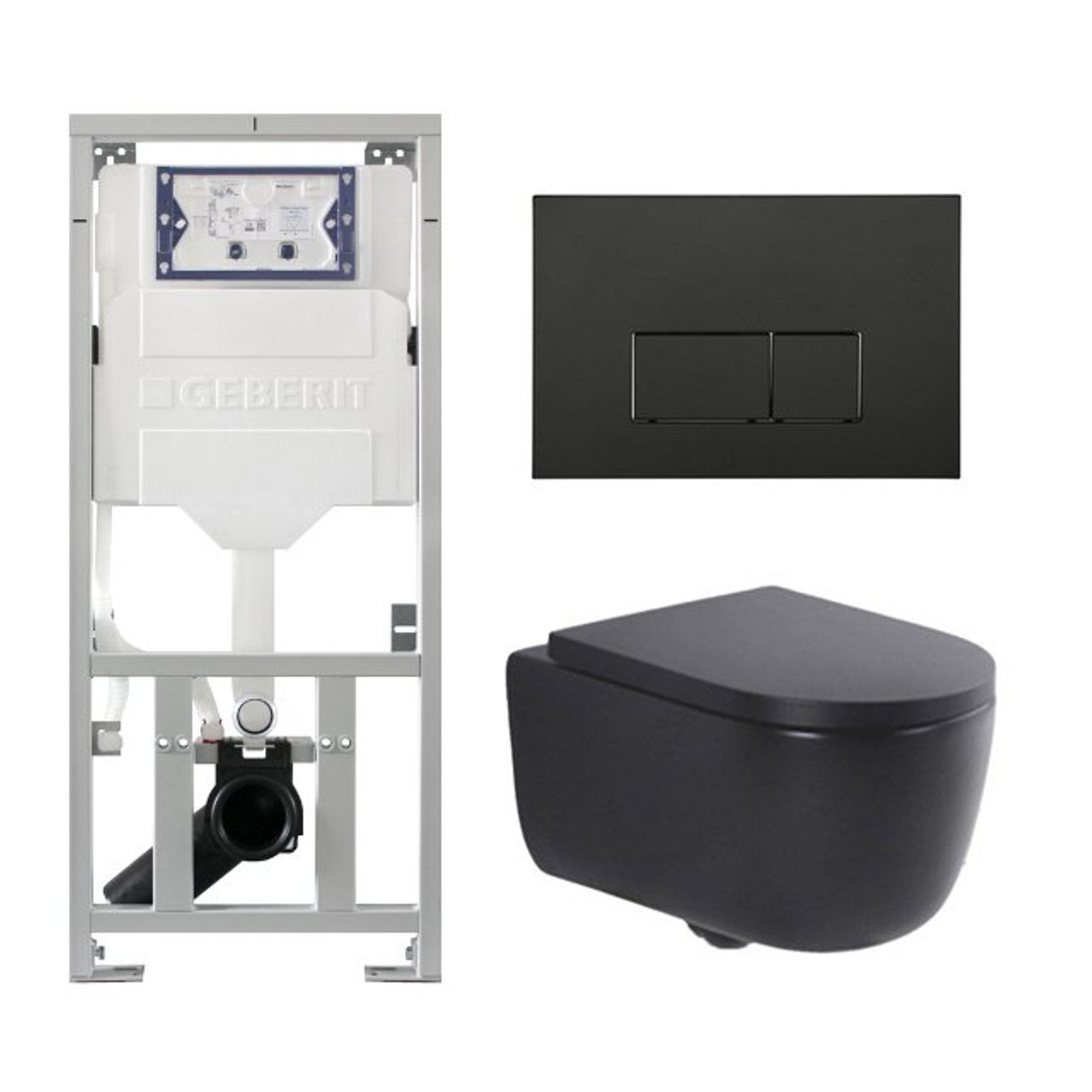 QeramiQ Dely Swirl Ensemble WC- 36.3x51.7cm - Réservoir encastré Geberit UP320 - Abattant de 35mm d'épaisseur - Plaque de commande en noir mat - Boutons rectangulaires - Noir mat