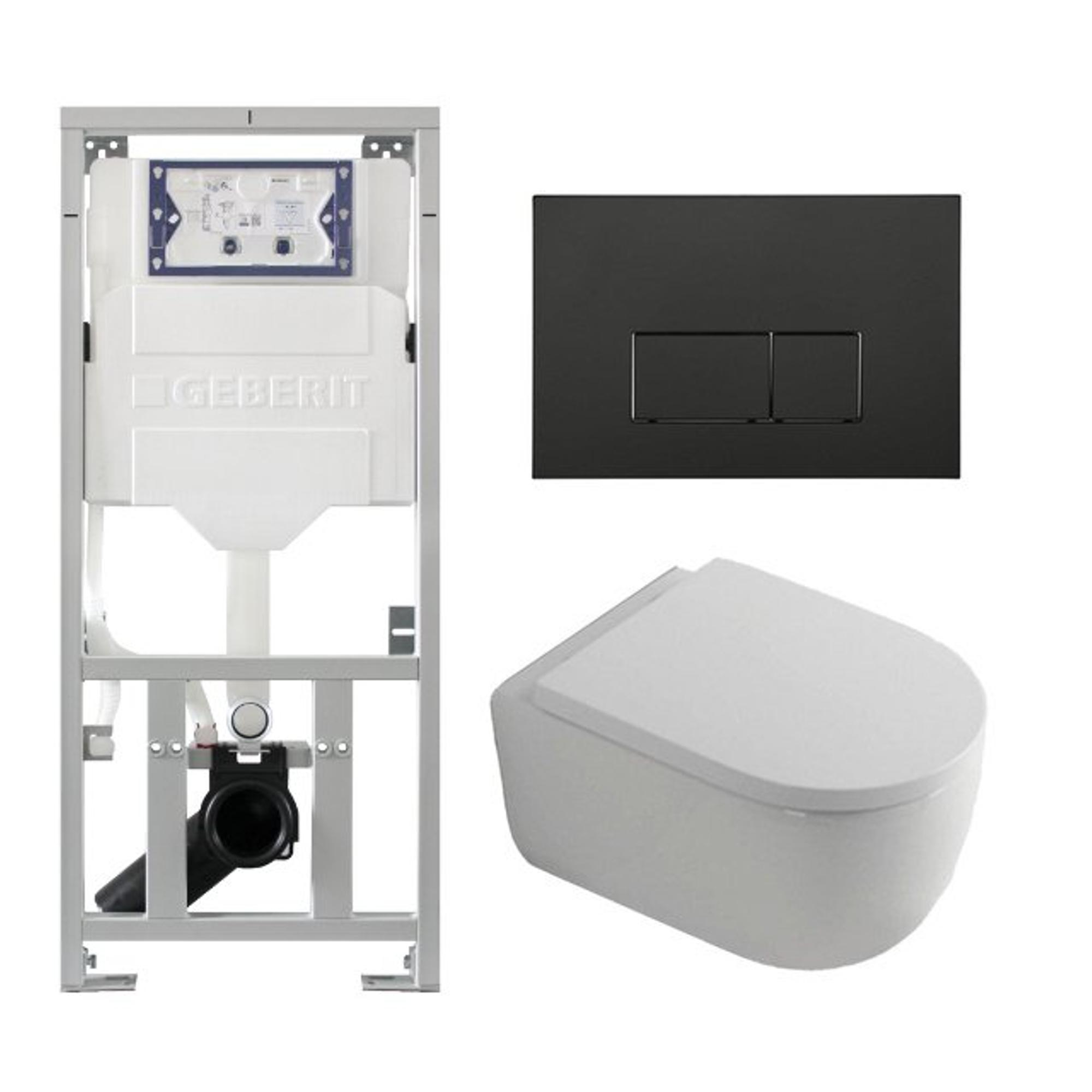 QeramiQ Dely Swirl Ensemble WC - 36.3x51.7cm - Réservoir encastré Geberit UP320 - Abattant de 35mm d'épaisseur - Plaque de commande noire mate - Boutons rectangulaires - Blanc mat