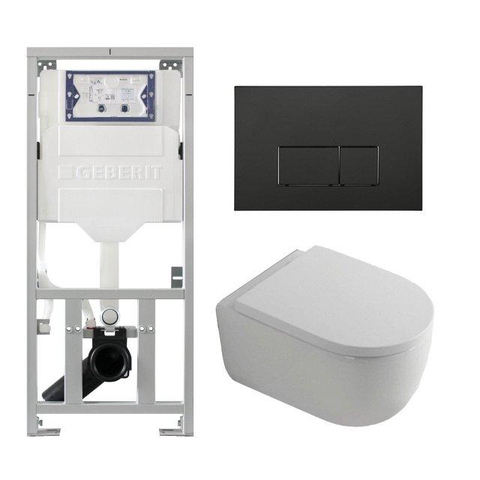 Ensemble de toilettes complet comprenant un pack de toilettes murales QeramiQ Dely avec abattant à fermeture frein de chute, un réservoir de chasse encastré Geberit et une plaque de commande QeramiQ Push.