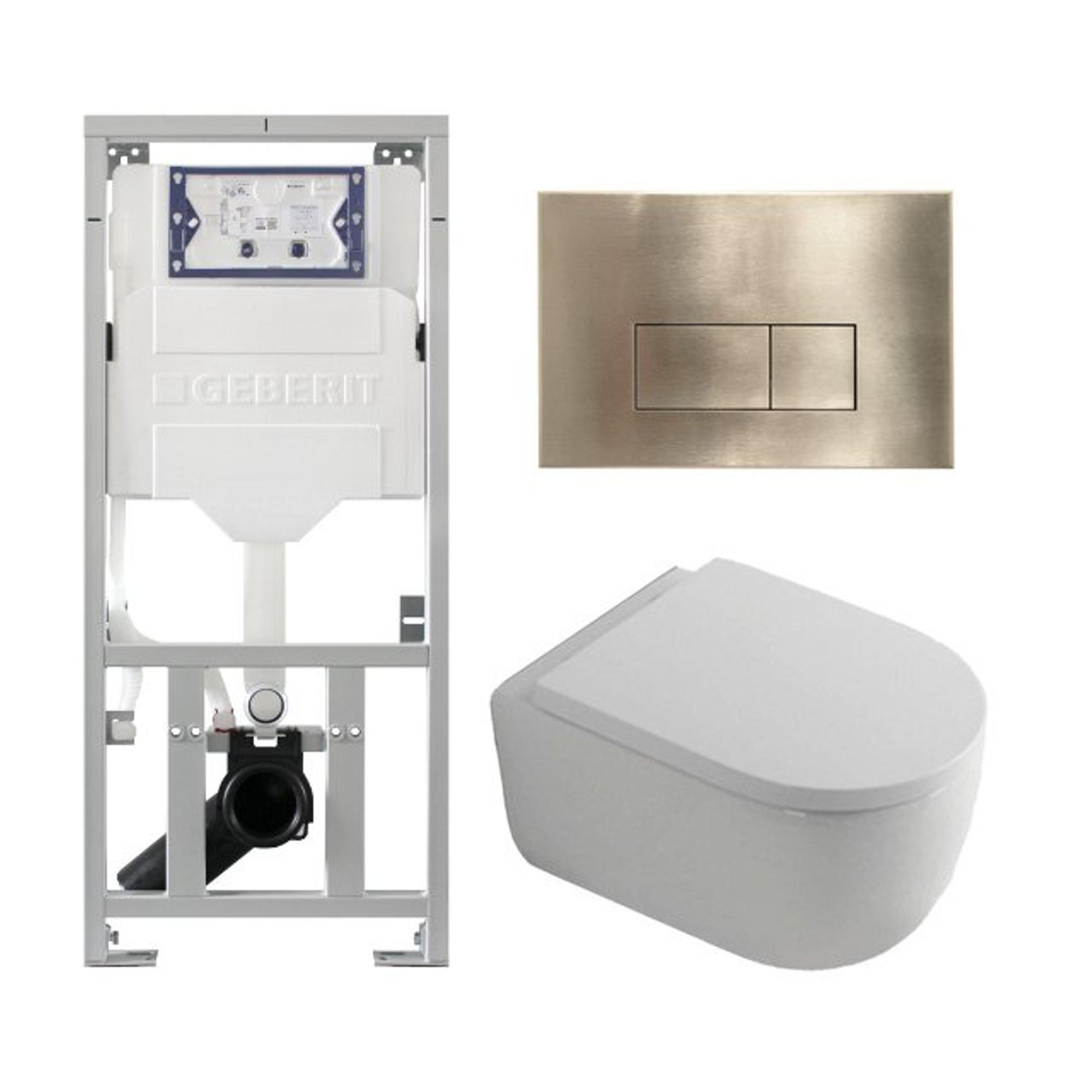 QeramiQ Dely Swirl Ensemble WC - 36.3x51.7cm - Fond creux - Sans bride - Réservoir encastré Geberit UP320 - Abattant de 35mm d'épaisseur - Plaque de commande en laiton brossé - Boutons rectangulaires - Blanc mat
