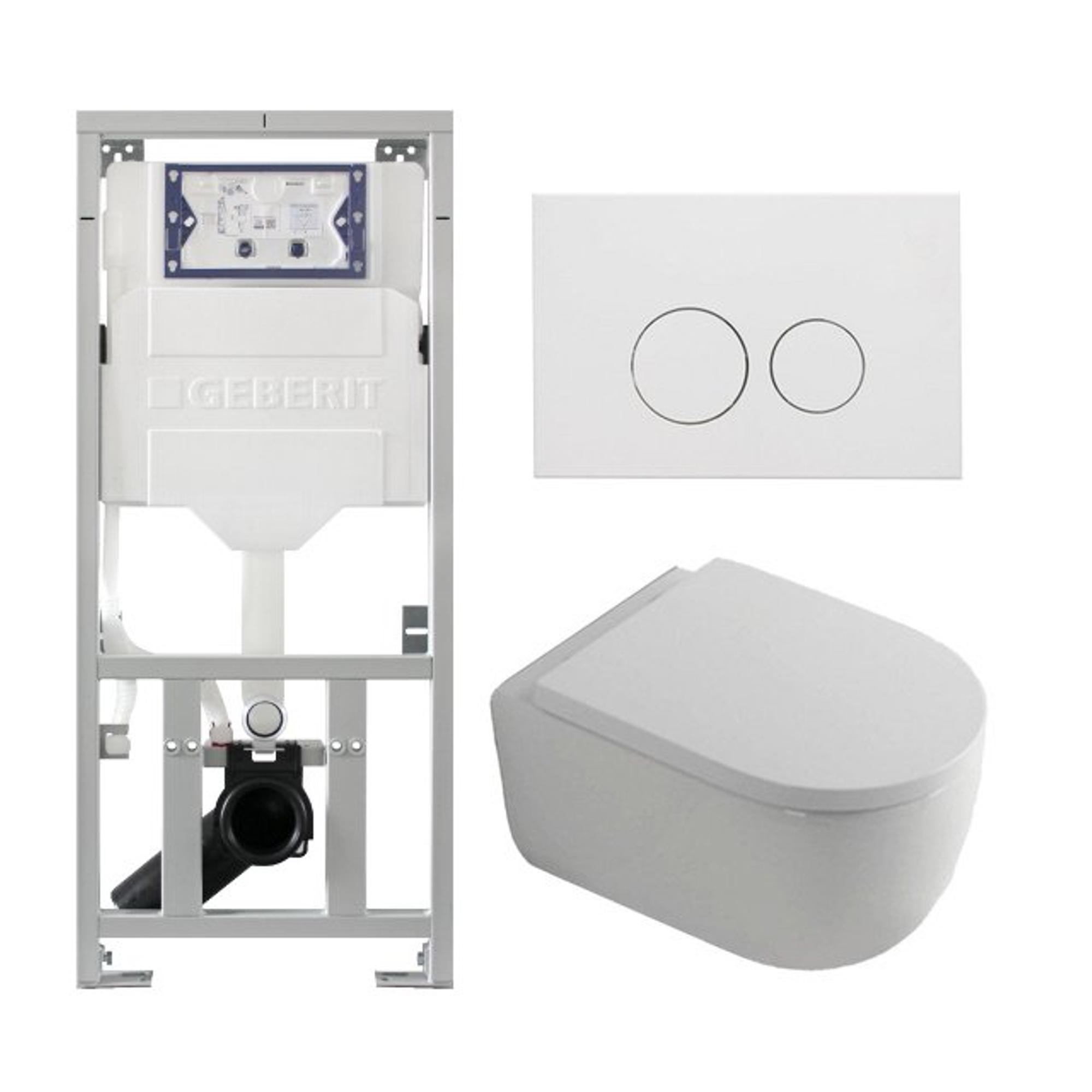 QeramiQ Dely Swirl Ensemble WC - 36.3x51.7cm - Fond creux - Sans bride - Réservoir encastré Geberit UP320 - Abattant de 35mm d'épaisseur - Plaque de commande en métal blanc mat - Boutons ronds - Blanc mat