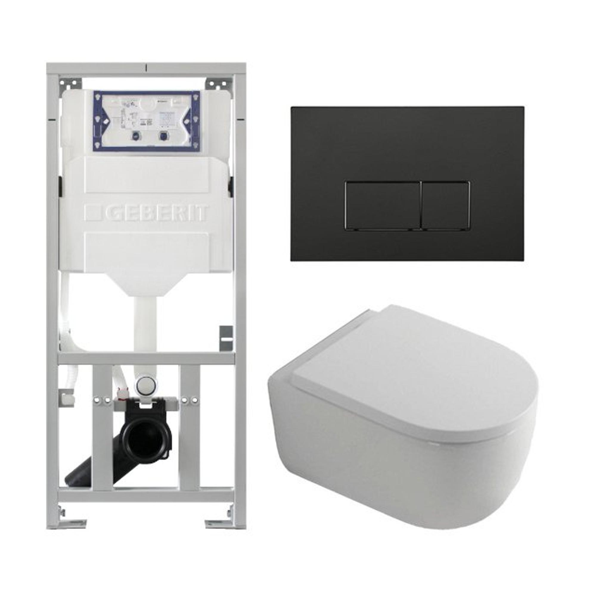 QeramiQ Dely Swirl Ensemble WC- 36.3x51.7cm - À fond creux - Sans bride - Réservoir encastré Geberit UP320 - Abattant de 35mm d'épaisseur - Plaque de commande en métal noir mat - Boutons rectangulaires - Blanc mat