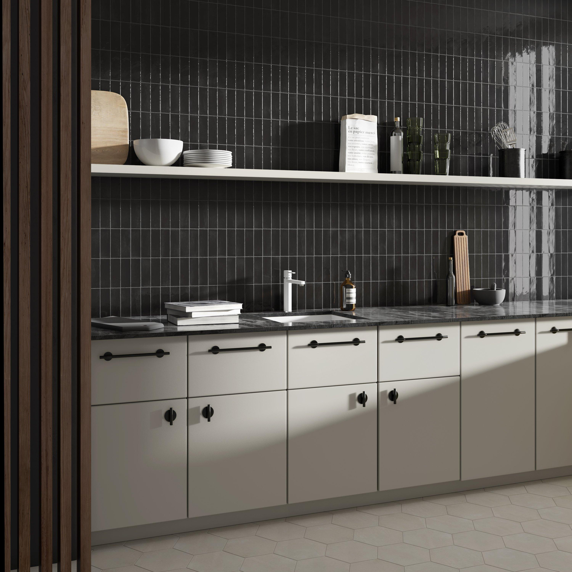 Les dimensions étroites de 15x5 cm vous offrent une grande liberté créative. Comme les carreaux sont plus petits que les carreaux muraux standard, vous créez davantage de lignes et de rythme sur le mur, ce qui donne immédiatement une impression de luxe et de sur-mesure. Pensez à un mur en chevrons remarquable derrière votre lavabo, à une pose verticale pour donner l’illusion d’un plafond plus haut ou à un soubassement mi-hauteur autour de la baignoire. Surtout dans les petits espaces, comme les toilettes ou une salle de bains compacte, ce format peut faire la différence : l’espace paraît plus dynamique et étudié, sans devenir chargé. Vous donnez ainsi à la conception de votre salle de bains une apparence professionnelle, entièrement adaptée à votre style.Noir profond et brillant pour un aspect luxueux