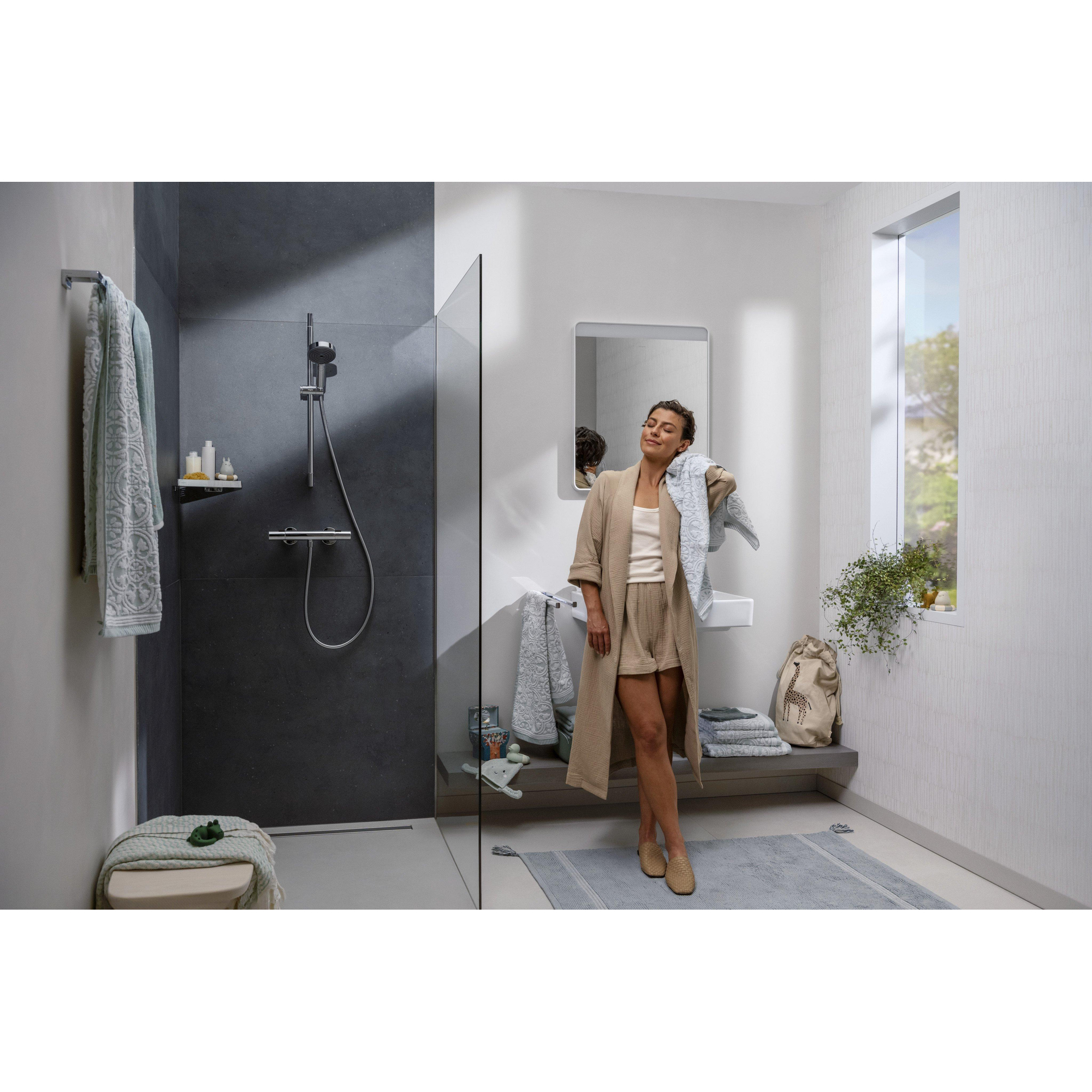 L'ensemble barre de douche hansgrohe Pulsify Select S Ensemble barre de douche - douchette à main - thermostat - barre de douche 65cm - flexible de douche - chrome est conçu pour une facilité d'utilisation quotidienne dans la salle de bains. La douchette à main tient confortablement en main et se règle aisément dans le support de la barre de douche, ce qui vous permet de passer rapidement d'une position fixe à une utilisation flexible. Les surfaces chromées de l'ensemble barre de douche et du flexible de douche se nettoient facilement, contribuant ainsi à un espace de douche hygiénique et à une brillance durable. Grâce à la conception claire du thermostat et de l'ensemble, le montage est simple à réaliser pour un installateur dans une configuration de douche ou de baignoire standard.