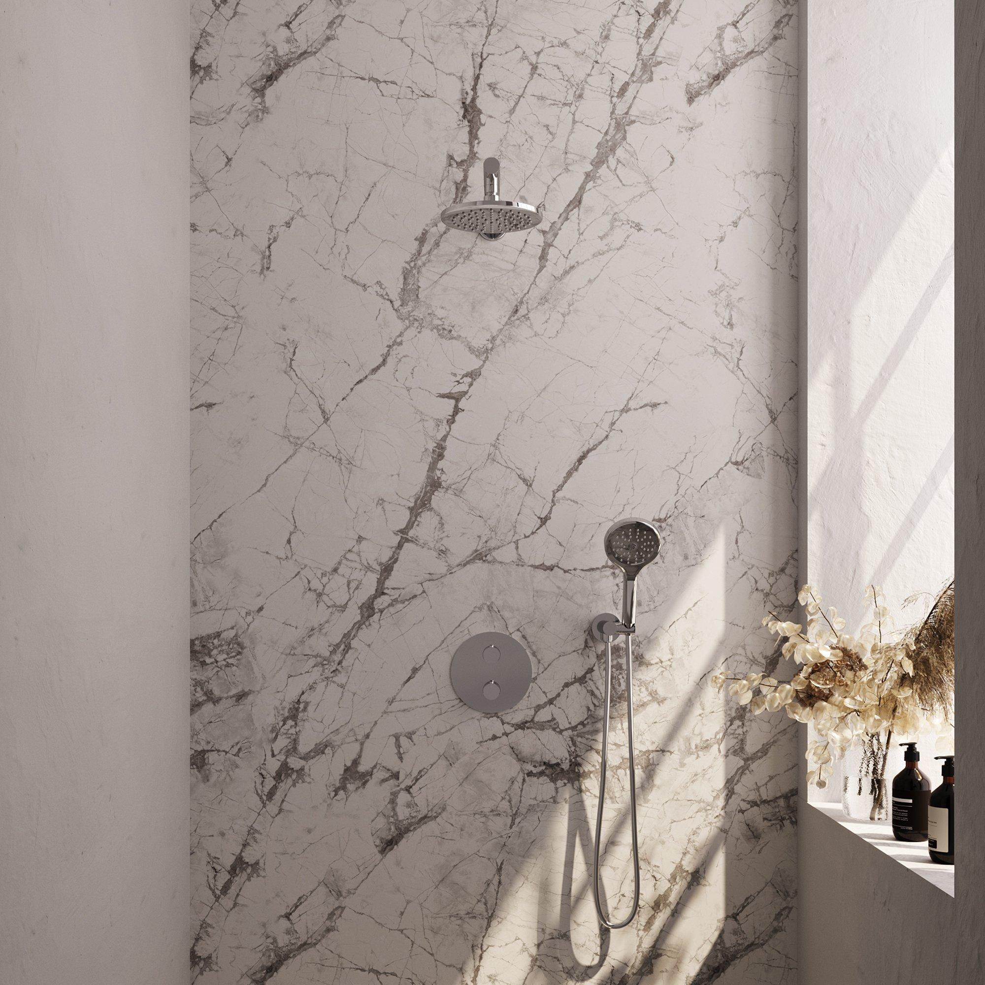 La BRAUER Chrome Carving mitigeur thermostatique encastré douche pluie dégage style et classe avec sa finition chrome et ses lignes épurées. Le design rond ajoute une touche moderne à toute salle de bain, tandis que la douche principale de 20cm assure une distribution uniforme de l'eau pour une expérience de douche rafraîchissante.