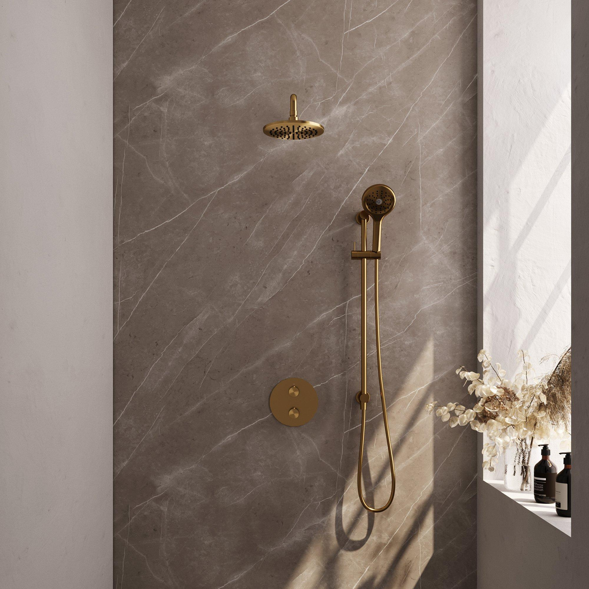 BRAUER Gold Edition douche thermostatique encastrée - 3 voies - rond - set 93 - douche principale de 20 cm - bras mural courbé - douchette à main 3 positions - flexible de douche - barre de douche intégrée - or brossé PVD