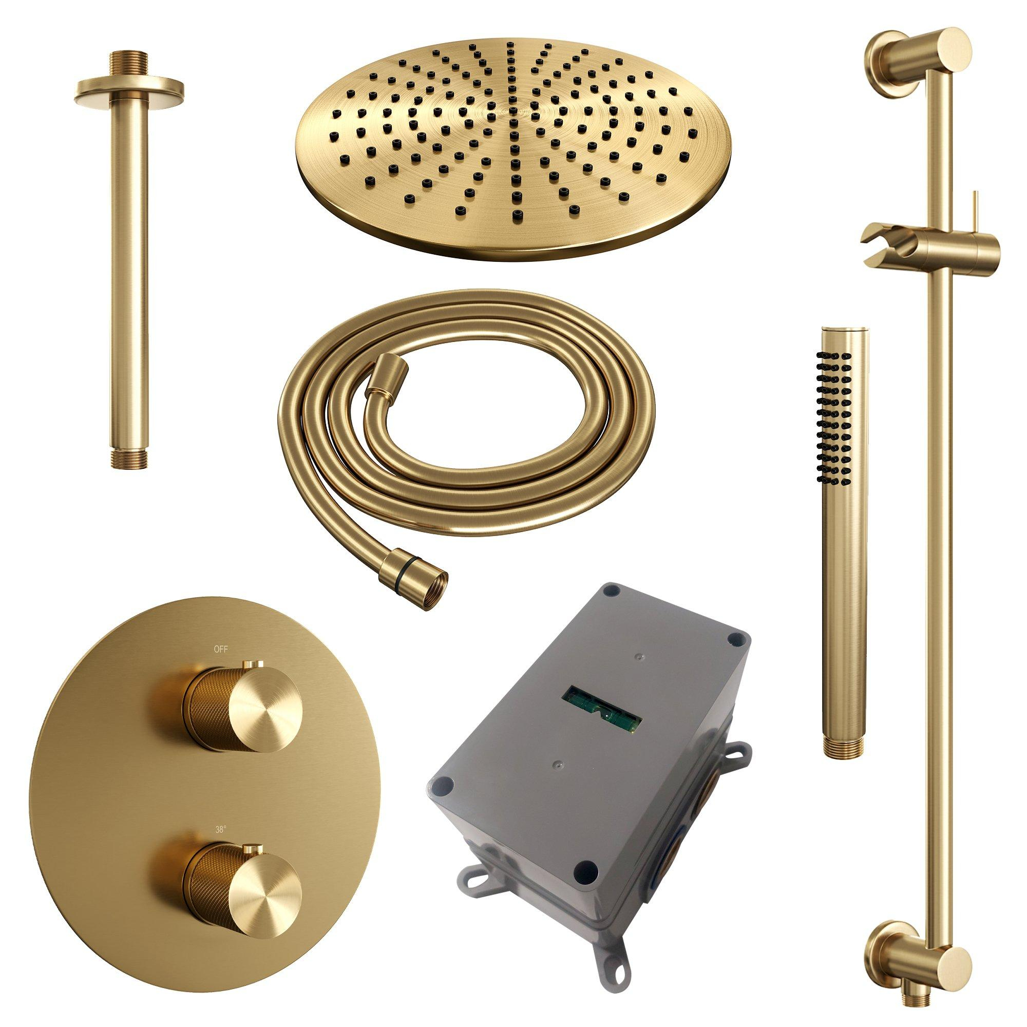 BRAUER Gold Carving douche de pluie encastrée thermostatique - 3 voies - rond - set 90 - douche de tête 30cm - bras de plafond - douchette barre - flexible de douche - barre de douche intégrée - or brossé PVD