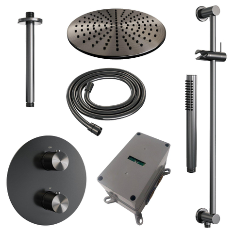BRAUER Gunmetal Edition douche de pluie encastrée thermostatique - 3 voies - ronde - set 90 - pomme de douche 30cm - bras de plafond - douchette à main barre - flexible de douche - barre de douche intégrée - gunmetal brossé PVD