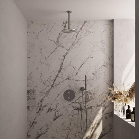 Avec une installation thermostatique et un système 3 voies, cette douche pluie offre une expérience de douche luxueuse. La possibilité d'ajuster la température de l'eau et le débit d'eau selon vos souhaits garantit un confort ultime pendant la douche. L'ensemble est livré complet avec un bras plafond, un flexible de douche et un coude mural, rendant tout ce dont vous avez besoin pour une douche relaxante à portée de main.