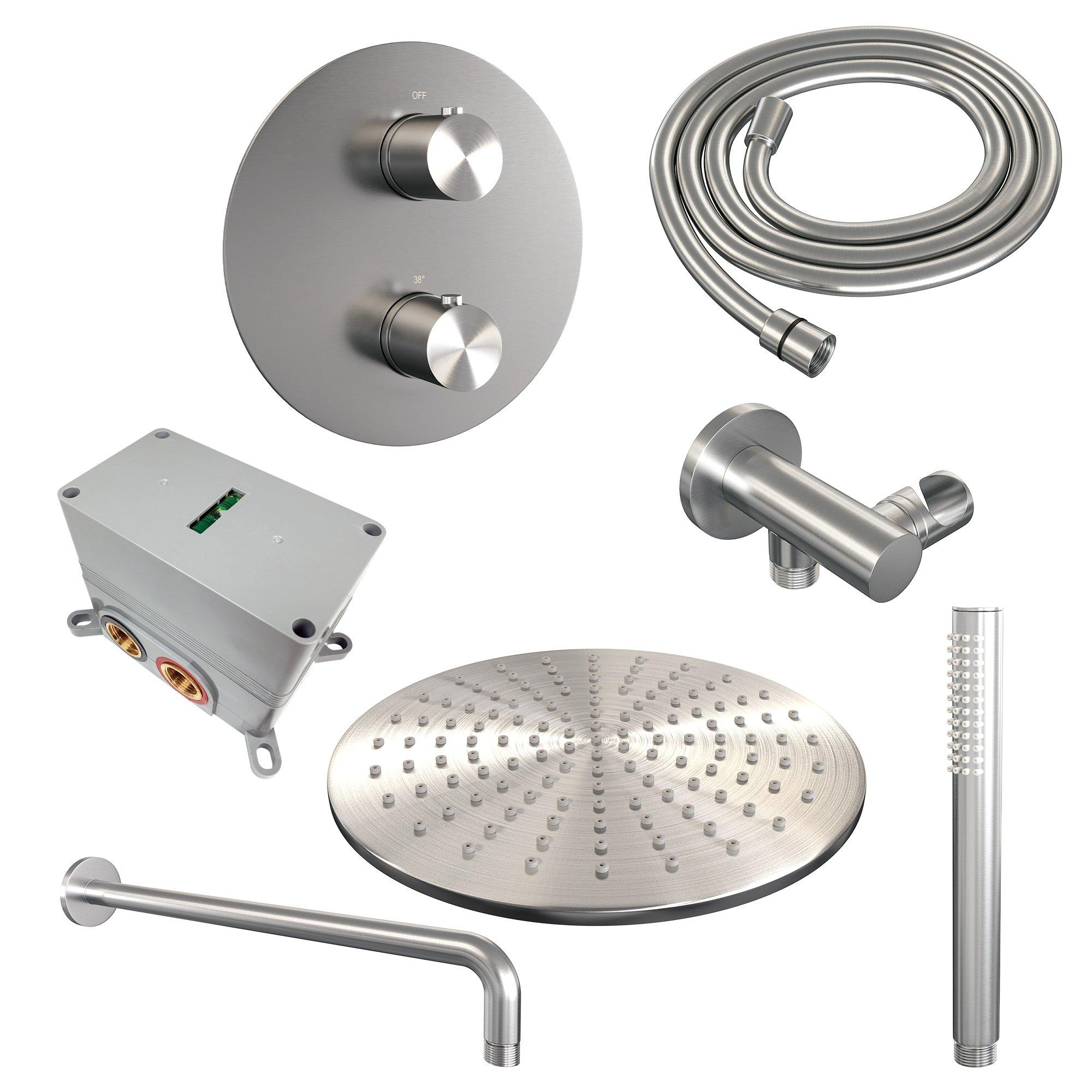 BRAUER Brushed Edition douche de pluie encastrée thermostatique - 3 voies - ronde - set 76 - pomme de douche 30 cm - bras mural courbé - douchette barre - flexible de douche - coude de raccord mural - acier inoxydable brossé PVD