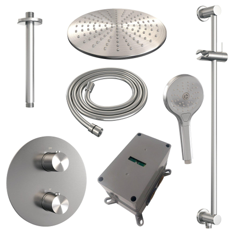 BRAUER Brushed Edition douche de pluie encastrée thermostatique - 3 voies - ronde - set 96 - pomme de douche 30cm - bras de plafond - douchette 3 jets - flexible de douche - barre de douche intégrée - inox brossé PVD