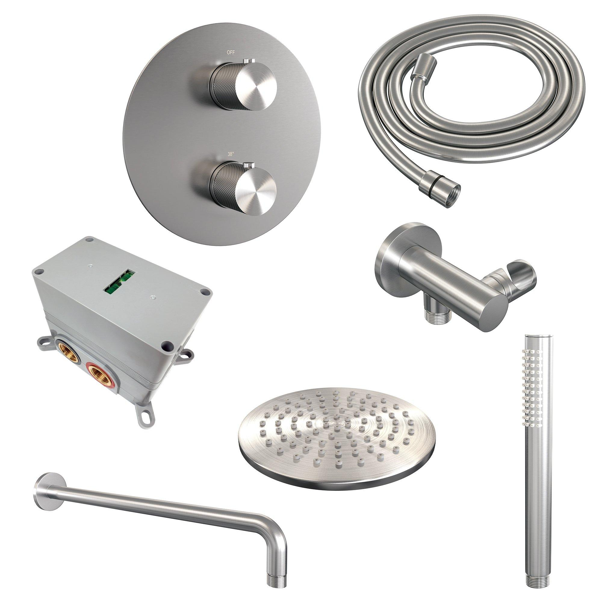 BRAUER Brushed Carving douche thermostatique encastrée pluie - 3 voies - rond - set 75 - douche principale 20cm - bras de mur courbé - douchette à main - flexible de douche - coude mural - inox brossé PVD