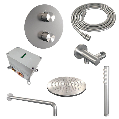 BRAUER Douche pluie thermostatique encastrée en acier inoxydable brossé - 3 voies - rond - ensemble 75 - douche principale de 20 cm - bras mural courbé - douchette à main - flexible de douche - coude mural - inox brossé PVD