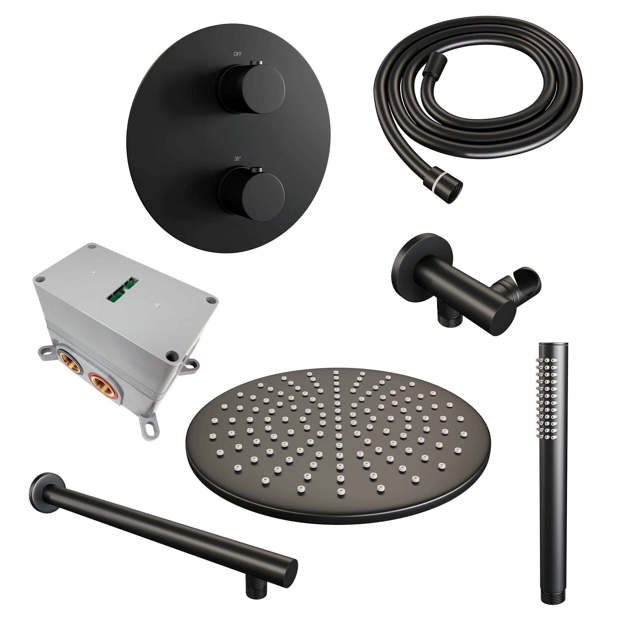 BRAUER Black Edition Douche de pluie encastrée thermostatique - 3 voies - ronde - set 74 - pomme de douche 30cm - bras mural droit - douchette barre - flexible de douche - coude de raccordement mural - noir mat
