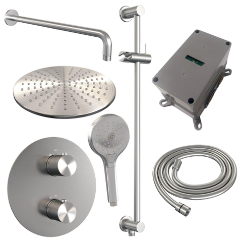 BRAUER Brushed Carving douche de pluie encastrée thermostatique - 3 voies - ronde - ensemble 94 - pomme de douche 30cm - bras mural courbé - douchette 3 jets - flexible de douche - barre de douche intégrée - inox brossé PVD