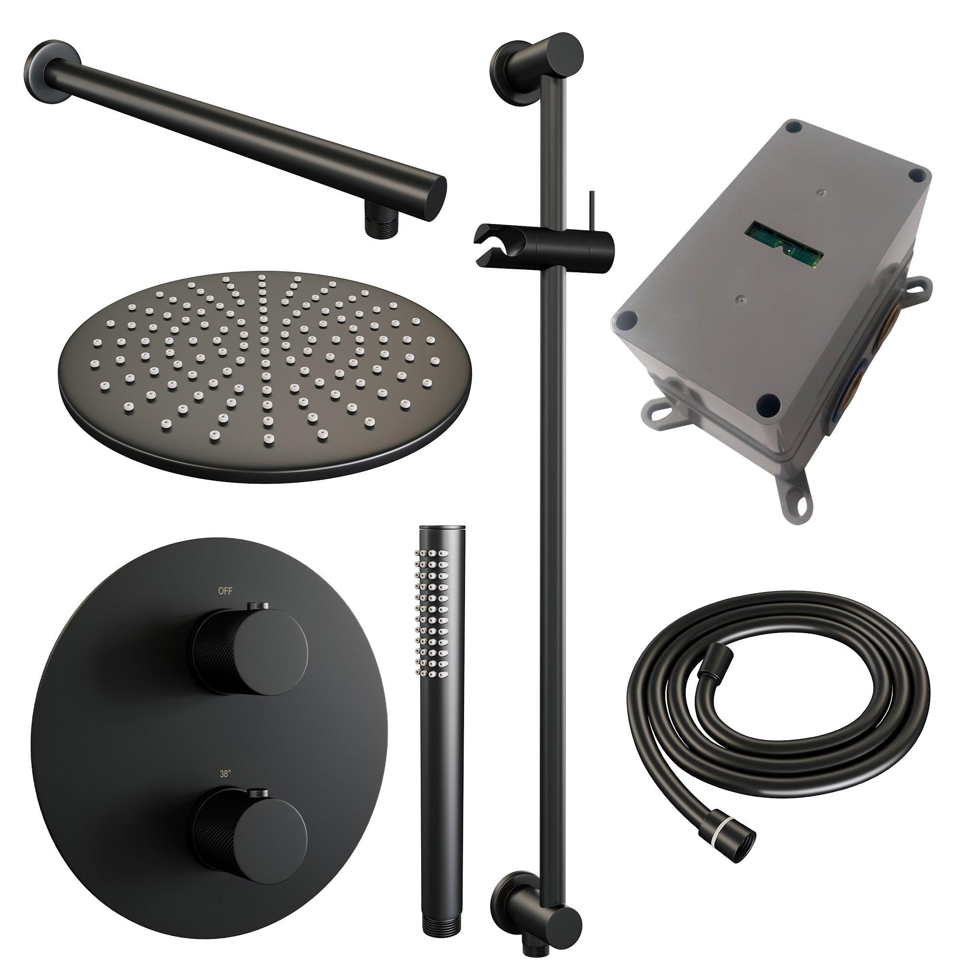 BRAUER Black Carving douche de pluie encastrée thermostatique - 3 voies - ronde - set 86 - pomme de douche 30cm - bras mural droit - pommeau de douche à main barre - flexible de douche - barre de douche intégrée - noir mat