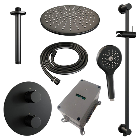 BRAUER Black Carving douche de pluie encastrée thermostatique - 3 voies - ronde - set 96 - pomme de douche 30cm - bras de plafond - douchette 3 jets - flexible de douche - barre de douche intégrée - noir mat