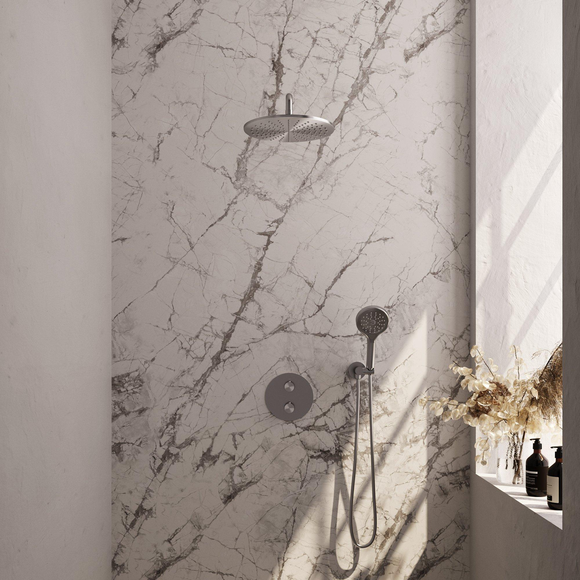 BRAUER Brushed Carving douche de pluie encastrée thermostatique - 3 voies - ronde - set 82 - douche de tête 30cm - bras mural courbé - douchette 3 jets - flexible de douche - coude d'alimentation mural - inox brossé PVD