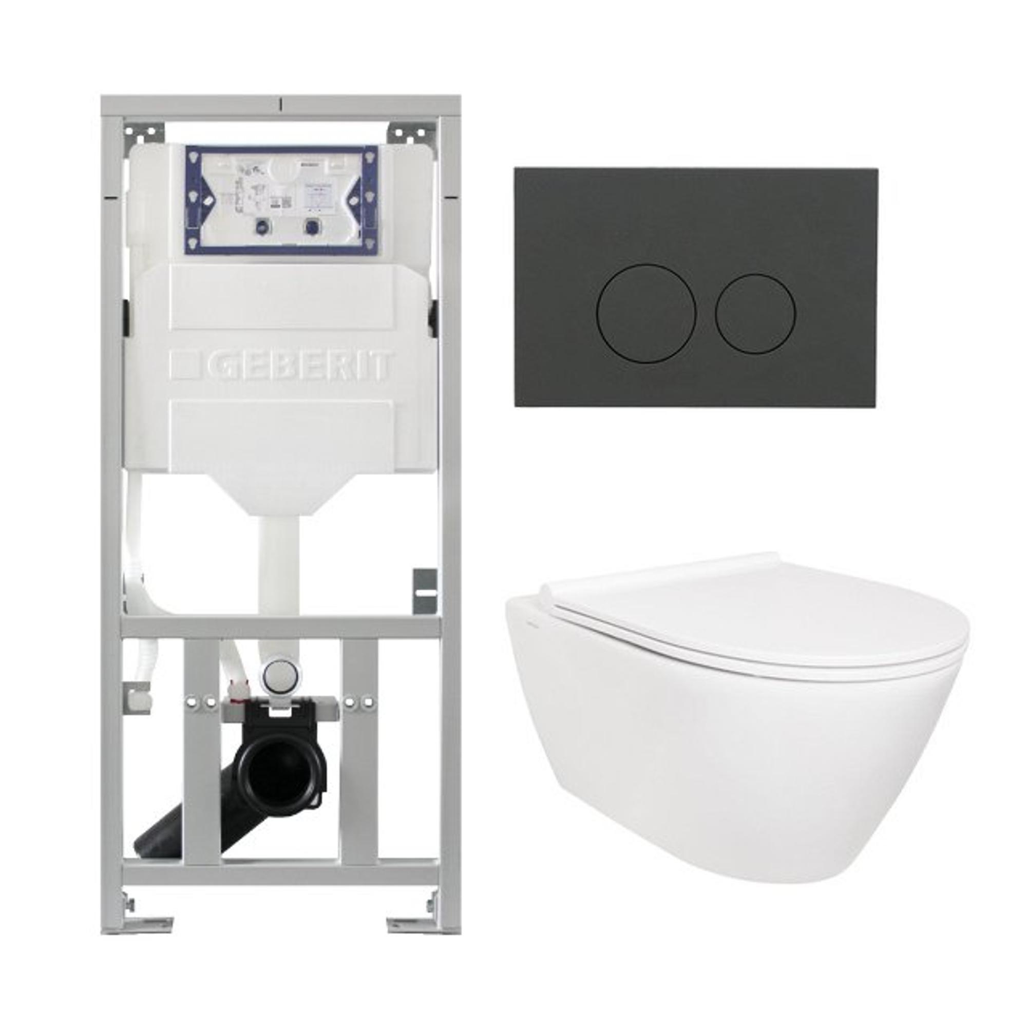 Pack WC QeramiQ Salina - sans bride - réservoir encastré Geberit - WC à fond creux - fermeture douce - déverrouillage rapide - plaque de commande en anthracite mat - boutons ronds - blanc