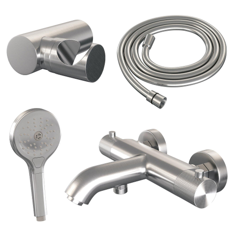 Robinet de baignoire Brauer brossé - ensemble de douche - douchette ronde 3 positions - bouton sculpté - PVD - Inox brossé