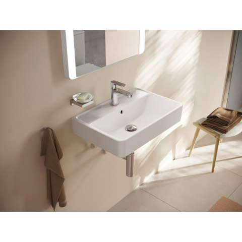 Avec une largeur de 60 cm et une profondeur de 37 cm, ce lavabo exploite de manière optimale l’espace disponible. Vous disposez de suffisamment de place pour vous laver confortablement les mains ou vous rafraîchir le visage, tandis que la profondeur compacte gêne le moins possible l’espace de circulation dans la salle de bains ou les toilettes. La forme softsquare – rectangulaire avec coins arrondis – assure une apparence conviviale et moins d’angles vifs, ce qui est appréciable dans les petits espaces où l’on circule plus près du lavabo. La cuve est positionnée au centre, de sorte que l’eau reste bien au milieu et que les éclaboussures soient limitées. Grâce au montage mural, vous gardez en outre le sol dégagé, ce qui donne non seulement une impression d’espace, mais facilite également le nettoyage.