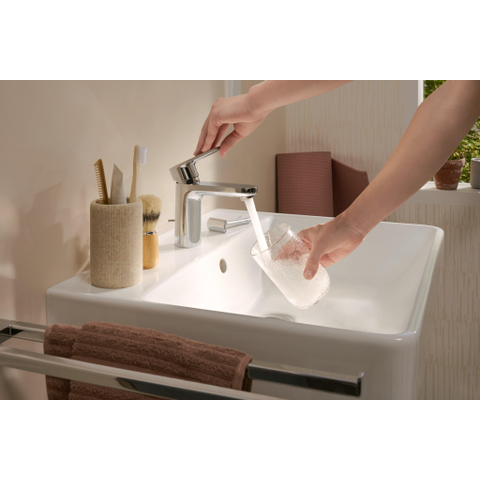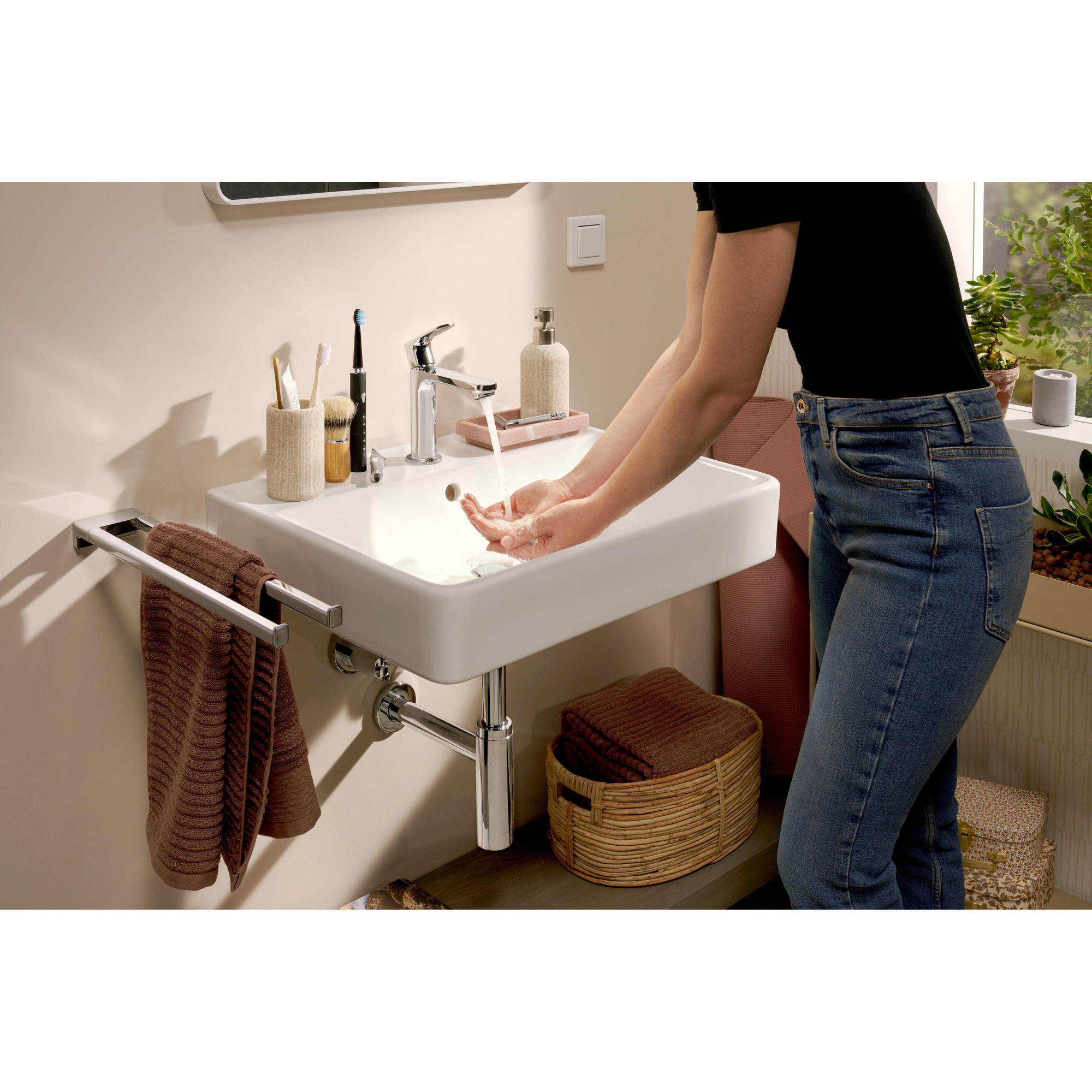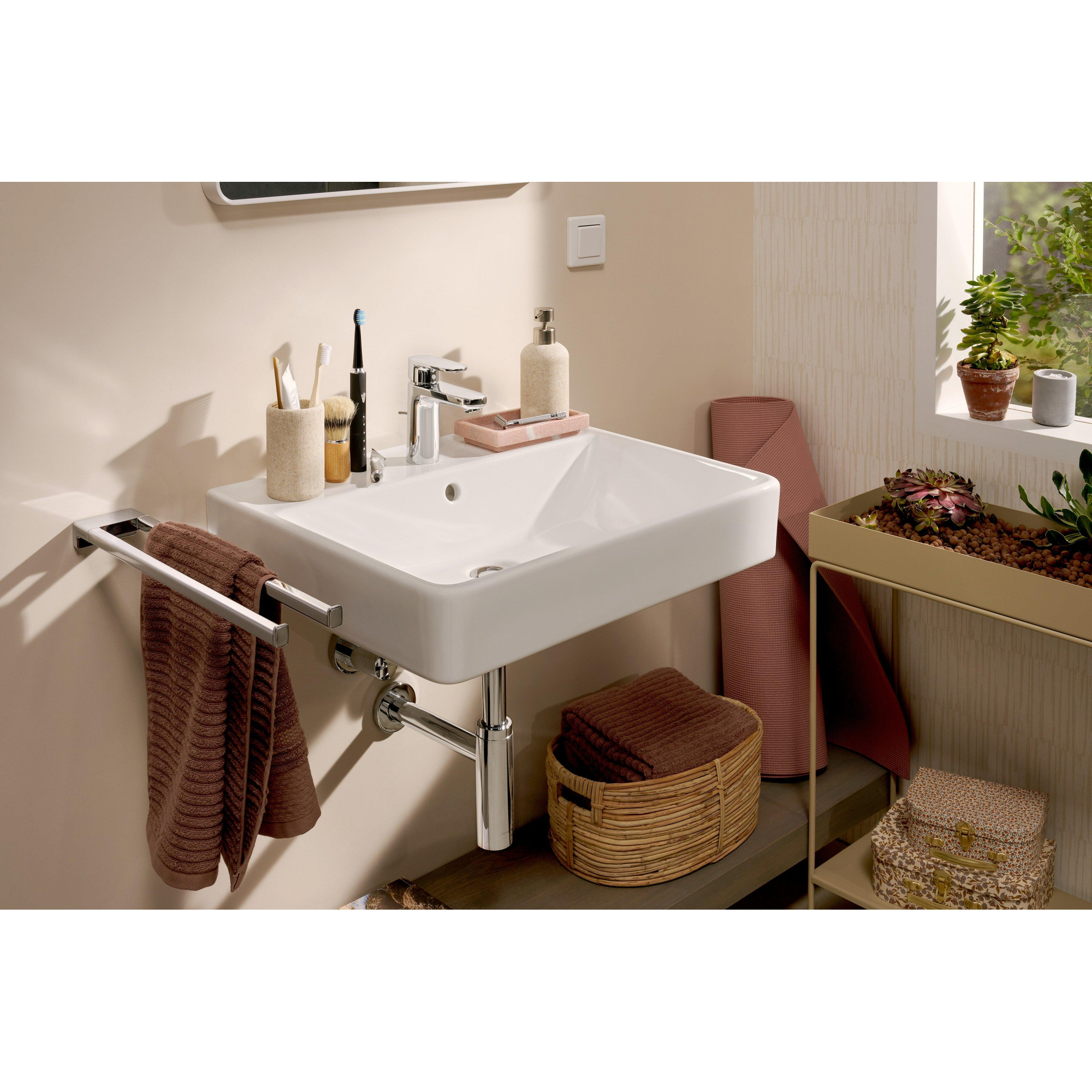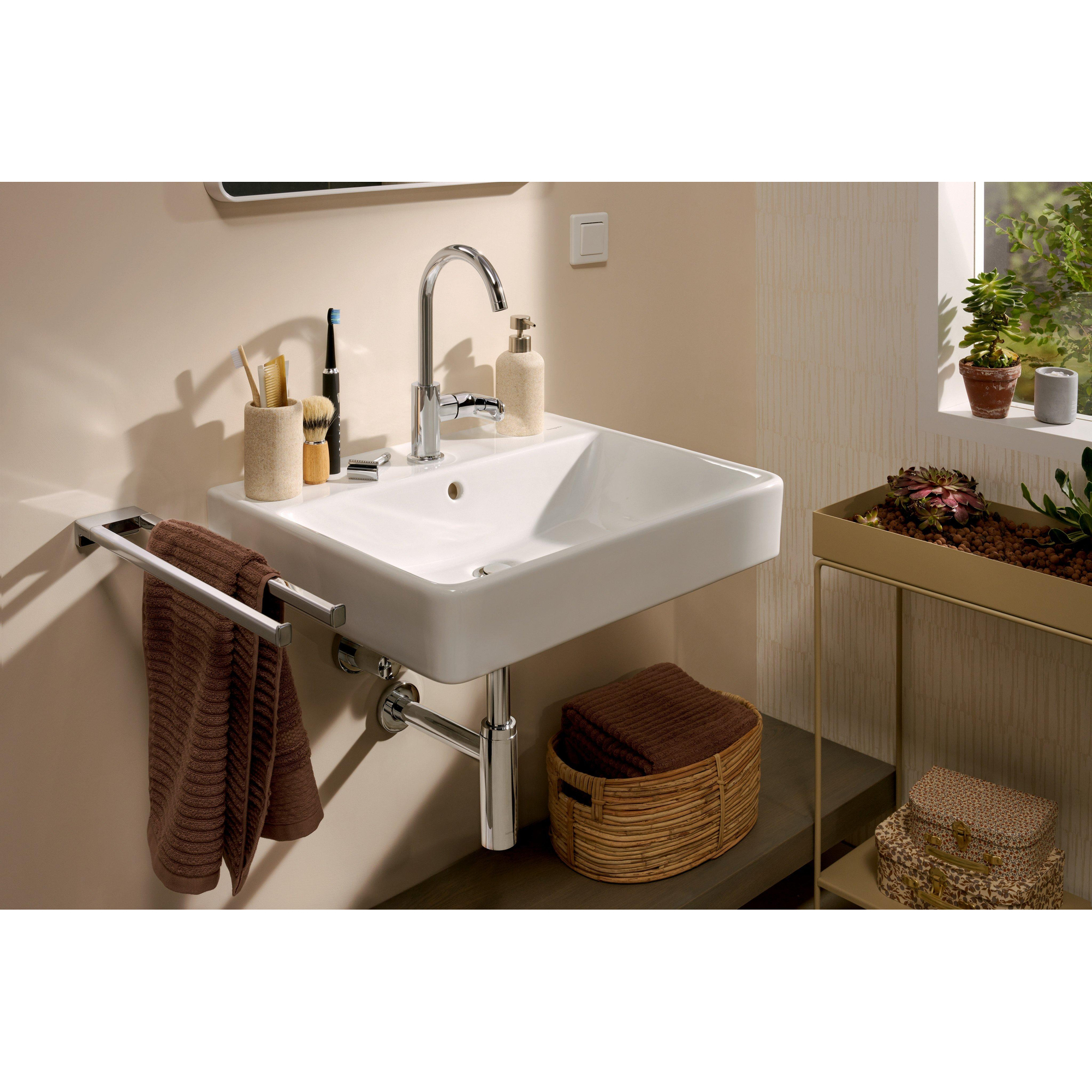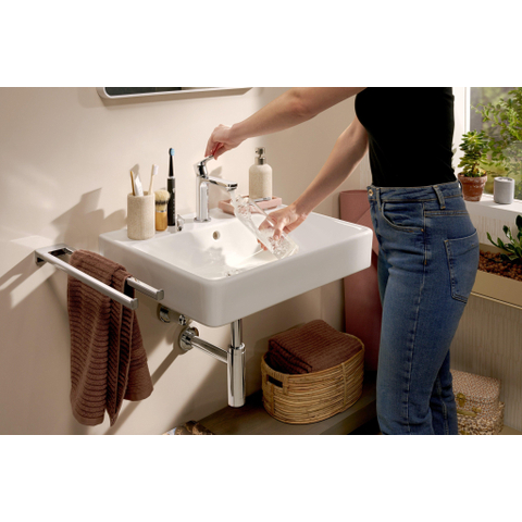 Avec un trou de robinet central et un trop-plein intégré, ce lavabo est conçu pour un confort d’utilisation quotidien. Le trop-plein empêche simplement l’eau de déborder de manière inattendue, ce qui est particulièrement rassurant dans un foyer animé ou lorsque les enfants ont tendance à ouvrir le robinet un peu trop fort. La bonde est placée au centre, de sorte que l’eau s’évacue rapidement et que moins de flaques restent dans la cuve. Comme ce modèle est monté au mur, vous pouvez facilement nettoyer en dessous ou laisser éventuellement un siphon design apparent. L’absence de robinet, de bonde clic-clac et de siphon fournis vous offre en outre la liberté de choisir exactement les produits qui correspondent à vos goûts et à vos besoins d’utilisation.