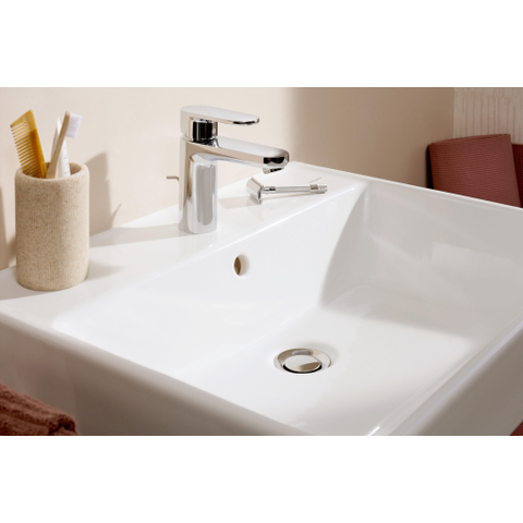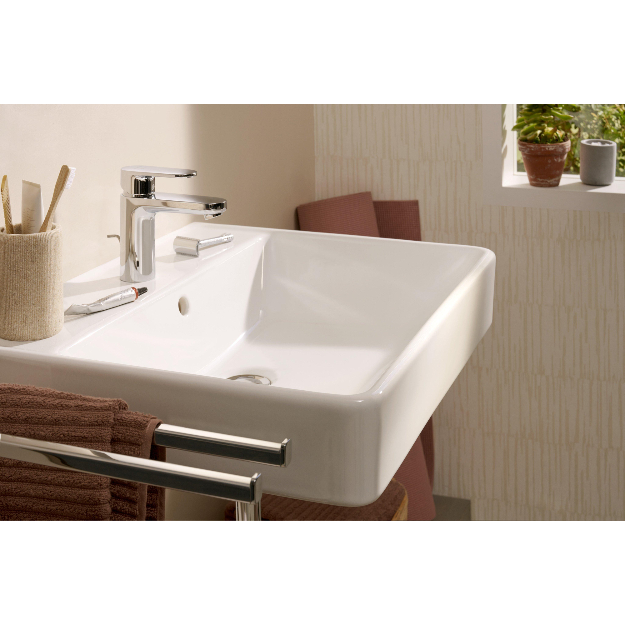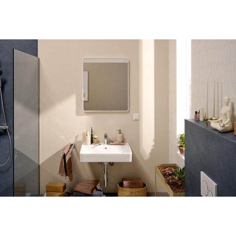 La forme rectangulaire avec angles arrondis offre un subtil équilibre entre lignes droites et courbes douces. Cela fait de ce lavabo une base idéale pour une salle de bains moderne, mais aussi pour un style intemporel ou scandinave. La céramique blanche brillante reflète joliment la lumière, ce qui donne à votre pièce une apparence plus grande et plus fraîche. Grâce aux bords fins et au grand bassin intérieur, vous profitez au maximum de chaque centimètre, sans que le lavabo paraisse massif. Combinez l’ensemble avec un mitigeur ou un robinet de surface élégant en chrome, en noir ou en métal brossé, et vous créez facilement un look luxueux qui restera actuel pendant de nombreuses années.