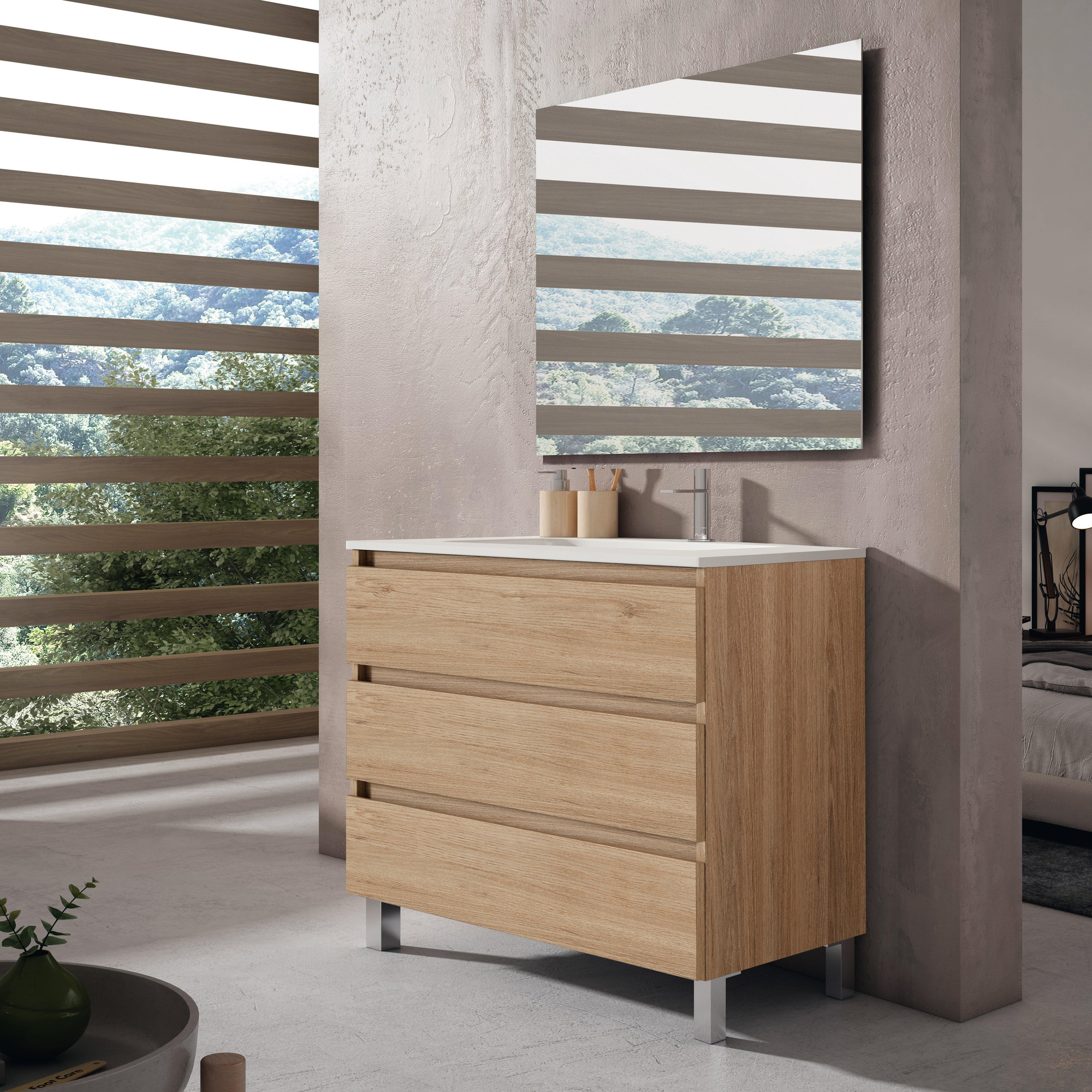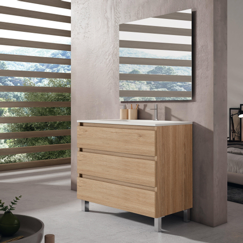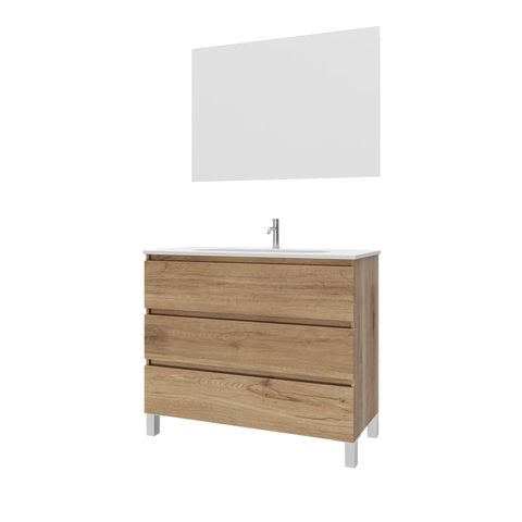 Saniclass Chaci PLUS Ensemble meuble de salle de bains - 100x86x46cm - lavabo en céramique blanc - 1 vasque - 1 trou de robinet - 3 tiroirs - miroir rectangulaire - chêne