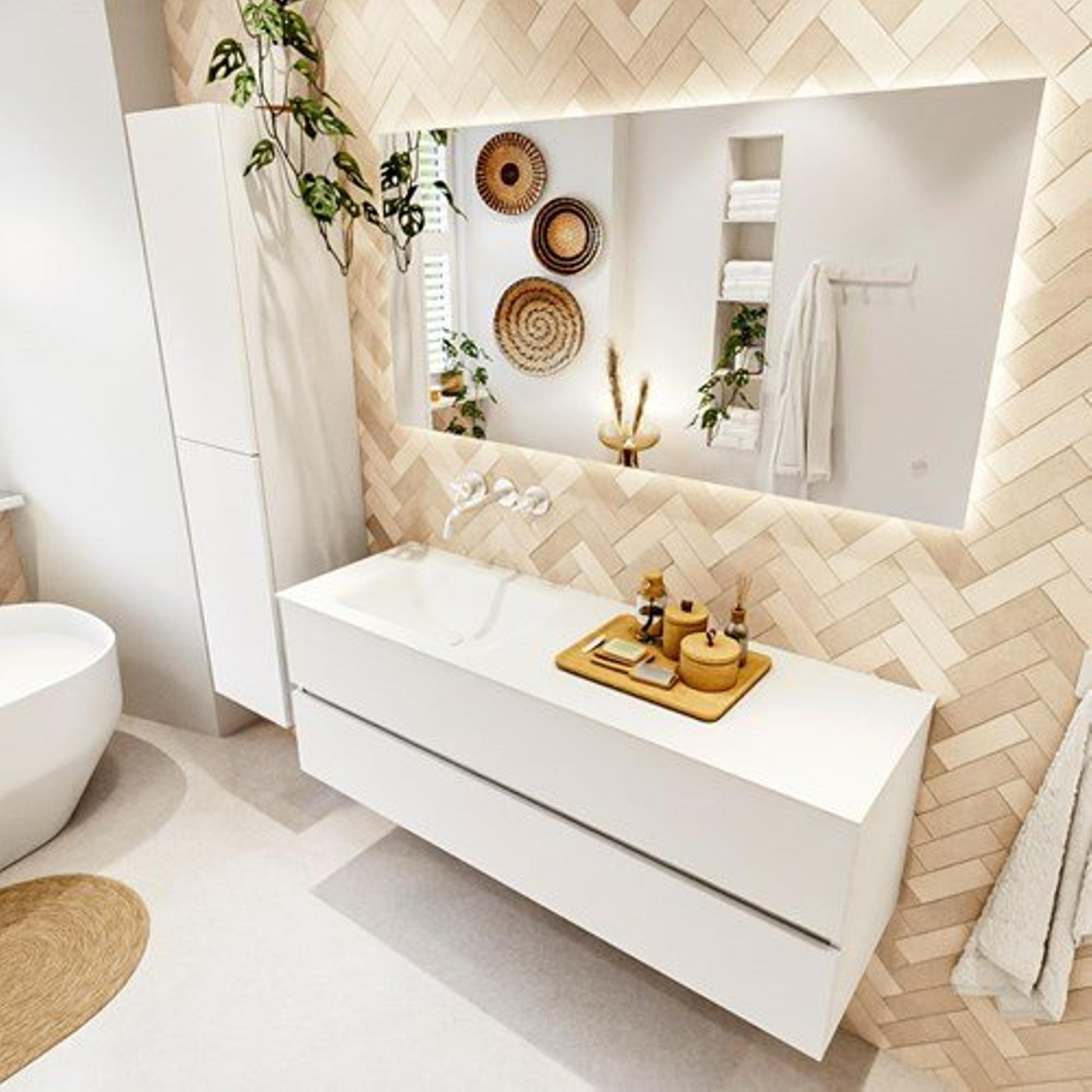 Avec ce meuble de salle de bains spacieux, vous créez en une seule fois du calme, de l’espace de rangement et une allure moderne et épurée. La combinaison d’un large sous-meuble avec deux tiroirs et d’un lavabo intégré le rend idéal pour les salles de bains de taille moyenne à grande, où vous souhaitez profiter du confort d’un large plan, tout en gardant l’ensemble sobre et ordonné. Grâce à la finition sans poignées et à la couleur douce et neutre, ce meuble s’intègre sans effort dans une salle de bains moderne, scandinave ou minimaliste. La vasque se trouve à gauche, ce qui vous offre sur la droite une surface supplémentaire pour poser vos produits de soin quotidiens. Si vous recherchez un meuble de salle de bains élégant qui n’attire pas bruyamment l’attention, mais qui apporte au contraire une base apaisante et un confort d’utilisation quotidien durable, cette version est un choix particulièrement réfléchi.