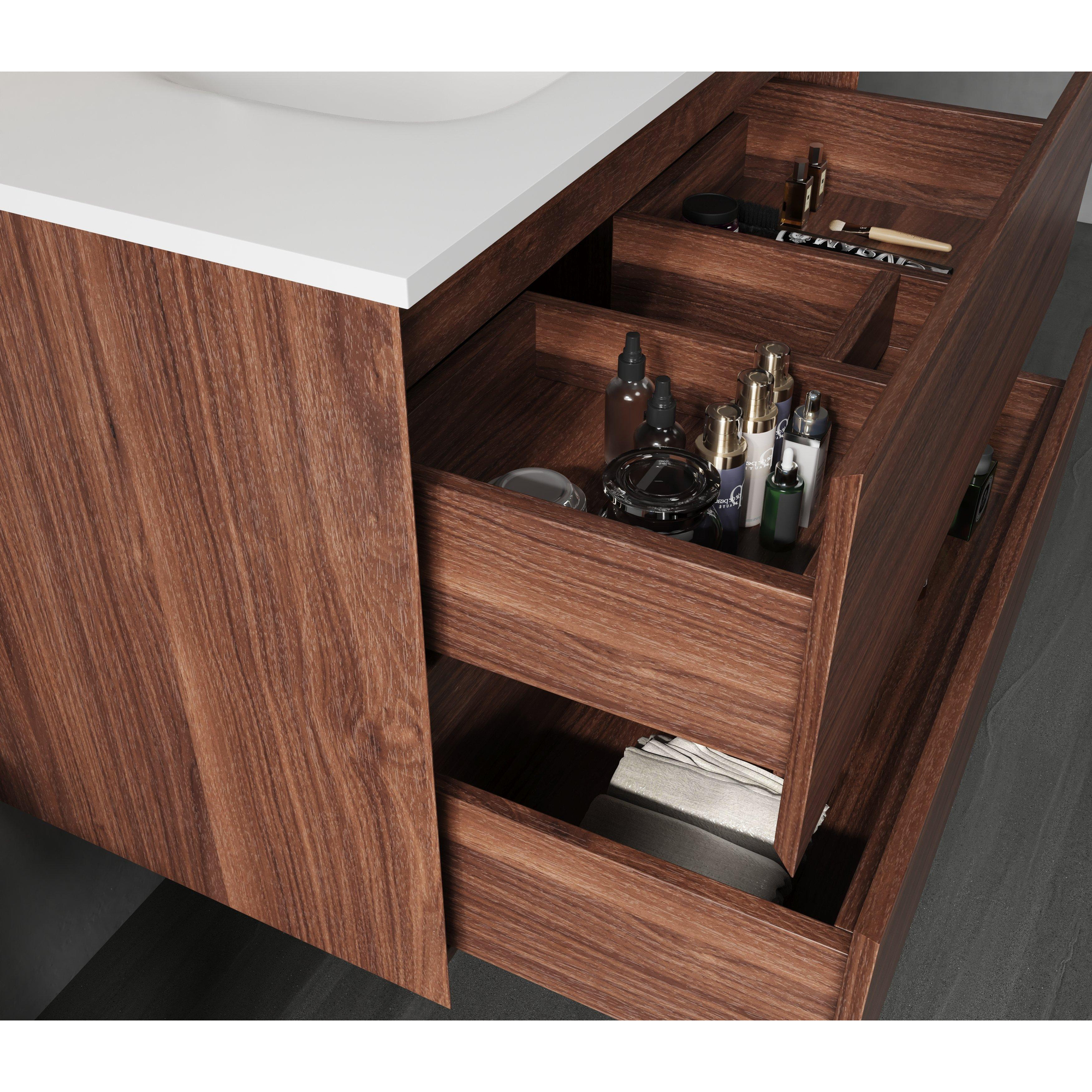 FonctionnelEn plus de son attrait visuel, ce meuble sous lavabo offre une fonctionnalité inégalée. Avec deux tiroirs spacieux, il offre suffisamment d'espace pour tous vos essentiels de salle de bain, des serviettes aux produits de beauté et plus encore. Chaque tiroir s'ouvre en douceur grâce aux solides glissières de tiroir de qualité, garantissant une expérience d'accès sans effort. Le design n'est pas seulement axé sur l'esthétique mais vise également la facilité d'utilisation. Les tiroirs sont équipés de solutions de rangement intelligentes qui vous permettent de garder vos affaires organisées et à portée de main. La profondeur des tiroirs offre la flexibilité de ranger à la fois des articles grands et petits de manière ordonnée, ce qui se traduit par un environnement de salle de bain rangé et apaisant. Que vous soyez pressé pendant votre routine matinale ou que vous preniez votre temps le soir, ce meuble sous lavabo offre le confort et l'ordre qui rendent chaque jour plus fluide.