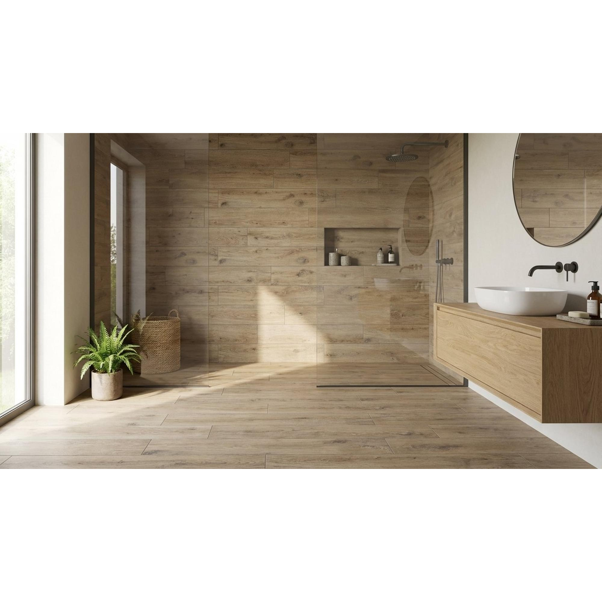 Avec une dimension de 23x120 cm, ce carreau possède le caractère d’une véritable lame de parquet, y compris les lignes allongées qui étirent visuellement votre pièce. Si vous posez les carreaux dans le sens de la longueur de la pièce, l’espace paraît automatiquement plus grand ; si vous optez pour une pose en chevrons ou en quinconce, le sol gagne un effet ludique et luxueux. Comme le carreau peut être utilisé à la fois comme carreau de sol et comme carreau mural, vous pouvez faire coïncider parfaitement murs et sols. Le rendu est particulièrement réussi derrière un meuble lavabo, dans la douche ou derrière une baignoire îlot. De plus, ce format lame s’inscrit parfaitement dans les tendances actuelles de l’intérieur, où les matériaux naturels, les lignes longues et les couleurs apaisantes occupent une place centrale.