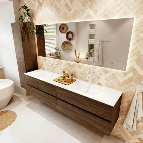 Avec ce meuble bas de salle de bains spacieux avec double lavabo, vous créez en une seule fois à la fois du calme et de l’espace dans la salle de bains. Grâce à la largeur de 160 cm et aux quatre grands tiroirs, c’est une solution idéale pour une salle de bains partagée, une salle de bains familiale très fréquentée ou lorsque vous aimez simplement avoir votre propre espace au lavabo. La combinaison du brun mocha chaleureux avec le plan vasque blanc en solid surface aux lignes épurées s’intègre parfaitement dans les salles de bains modernes et luxueuses, mais aussi dans un style naturel et apaisant. Grâce aux deux vasques et aux deux positions de robinet, vous évitez les embouteillages matinaux au lavabo et vous veillez à ce que chacun puisse commencer la journée confortablement. Vous optez ainsi pour un meuble qui n’est pas seulement esthétique, mais qui rend surtout votre utilisation quotidienne beaucoup plus facile.
