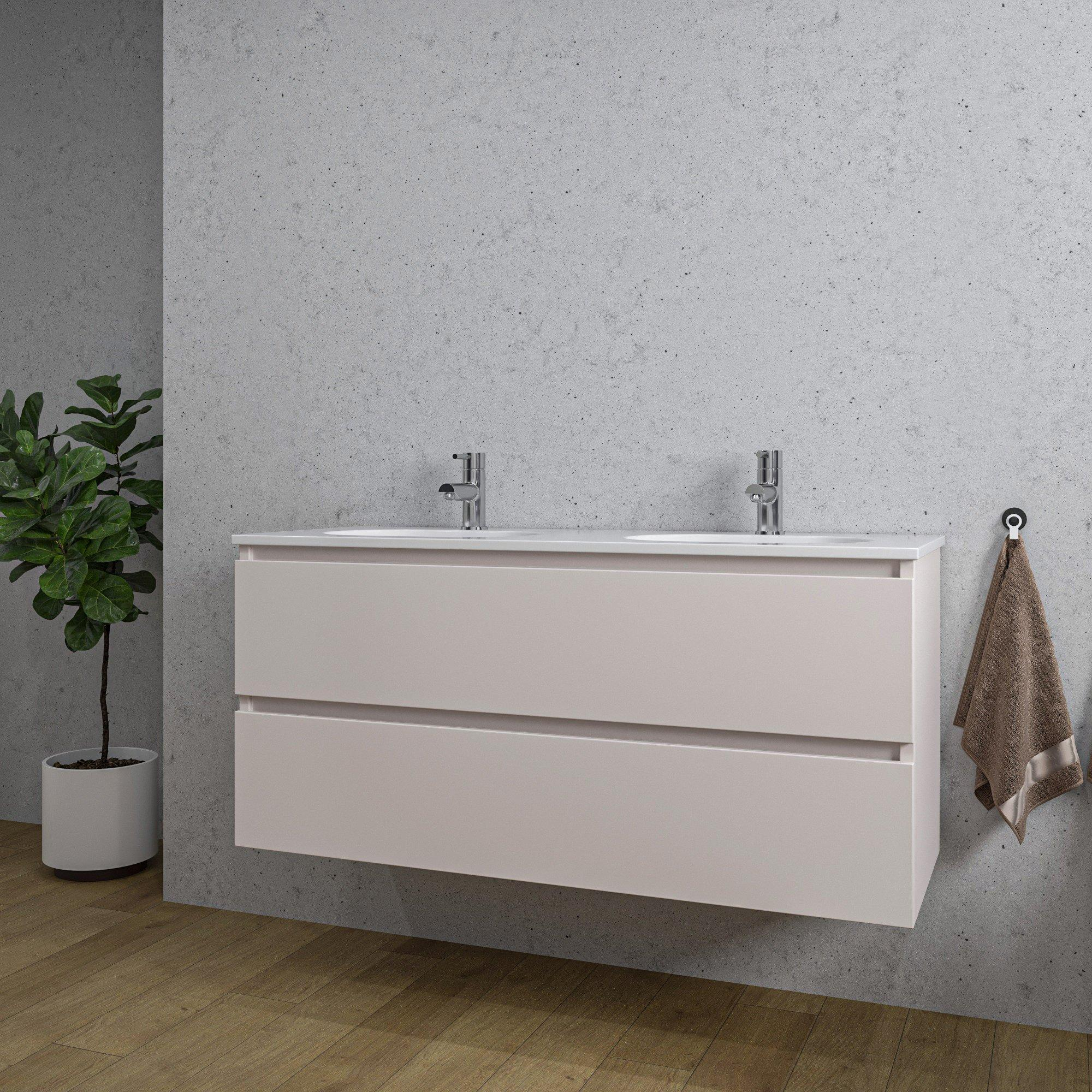 Saniclass Chaci Ensemble meuble de salle de bains - 120x46x57cm - lavabo en céramique blanc - 2 vasques ovales - 2 trous de robinet - 2 tiroirs - cotton mat (beige)