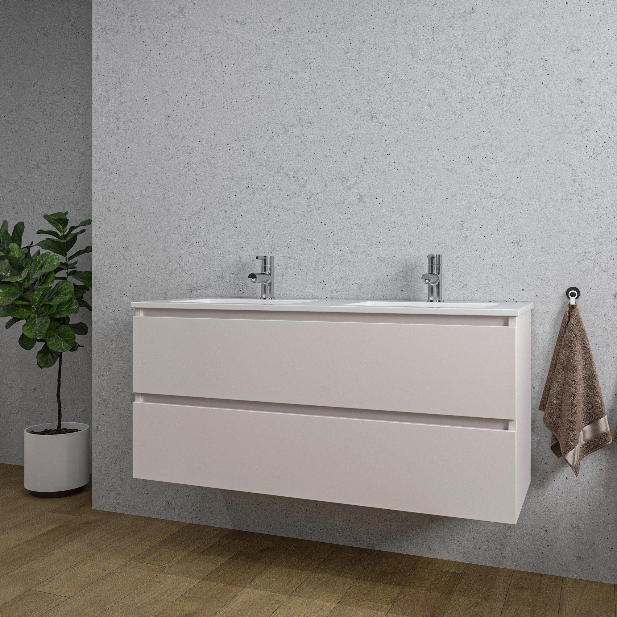 Saniclass Chaci Ensemble meuble de salle de bains - 120x46x57cm - lavabo en céramique blanc - 2 vasques - 2 trous de robinet - 2 tiroirs - cotton mat (beige)