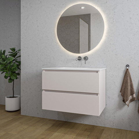 Saniclass Chaci Ensemble meuble de salle de bains - 80x46x55cm - lavabo en céramique blanc - 1 vasque - sans trous de robinet - 2 tiroirs - miroir rond avec éclairage - cotton mat (beige)