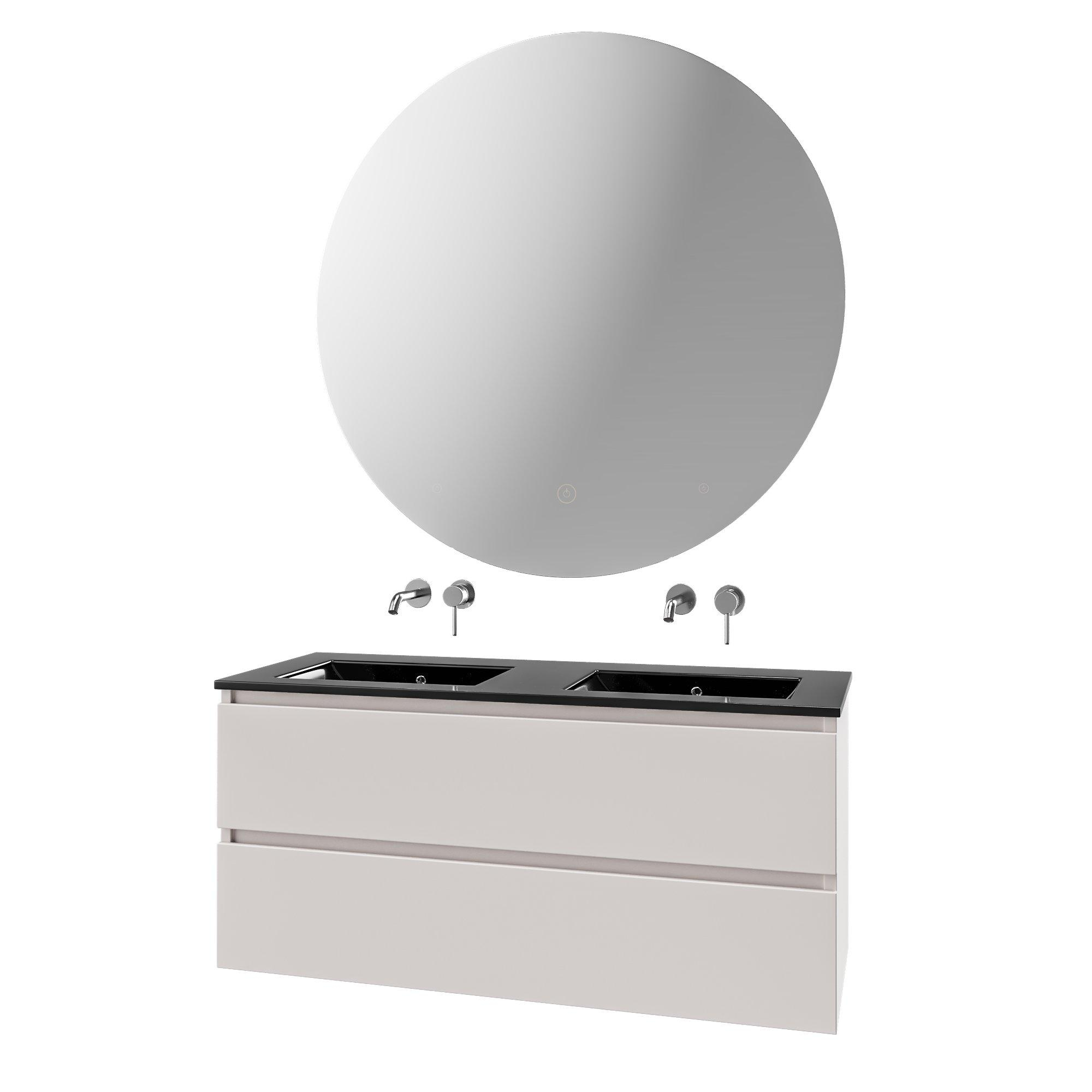 Saniclass Chaci Ensemble meuble de salle de bains - 120x46x55cm - lavabo céramique noir - 2 vasques - sans trous de robinet - 2 tiroirs - miroir rond avec éclairage - cotton mat (beige)