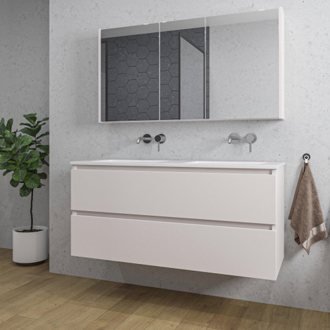 Saniclass Chaci Ensemble meuble de salle de bains - 120x46x55cm - vasque en céramique blanche - 2 vasques - sans trous de robinet - 2 tiroirs - armoire de toilette - cotton mat (beige)