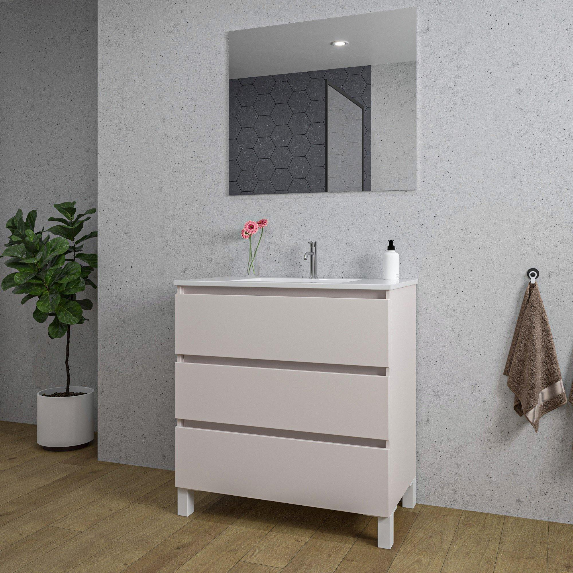 Saniclass Chaci PLUS Ensemble meuble de salle de bains - 80x86x46cm - lavabo en céramique blanc - 1 vasque - 1 trou de robinet - 3 tiroirs - miroir rectangulaire - coton mat (beige)