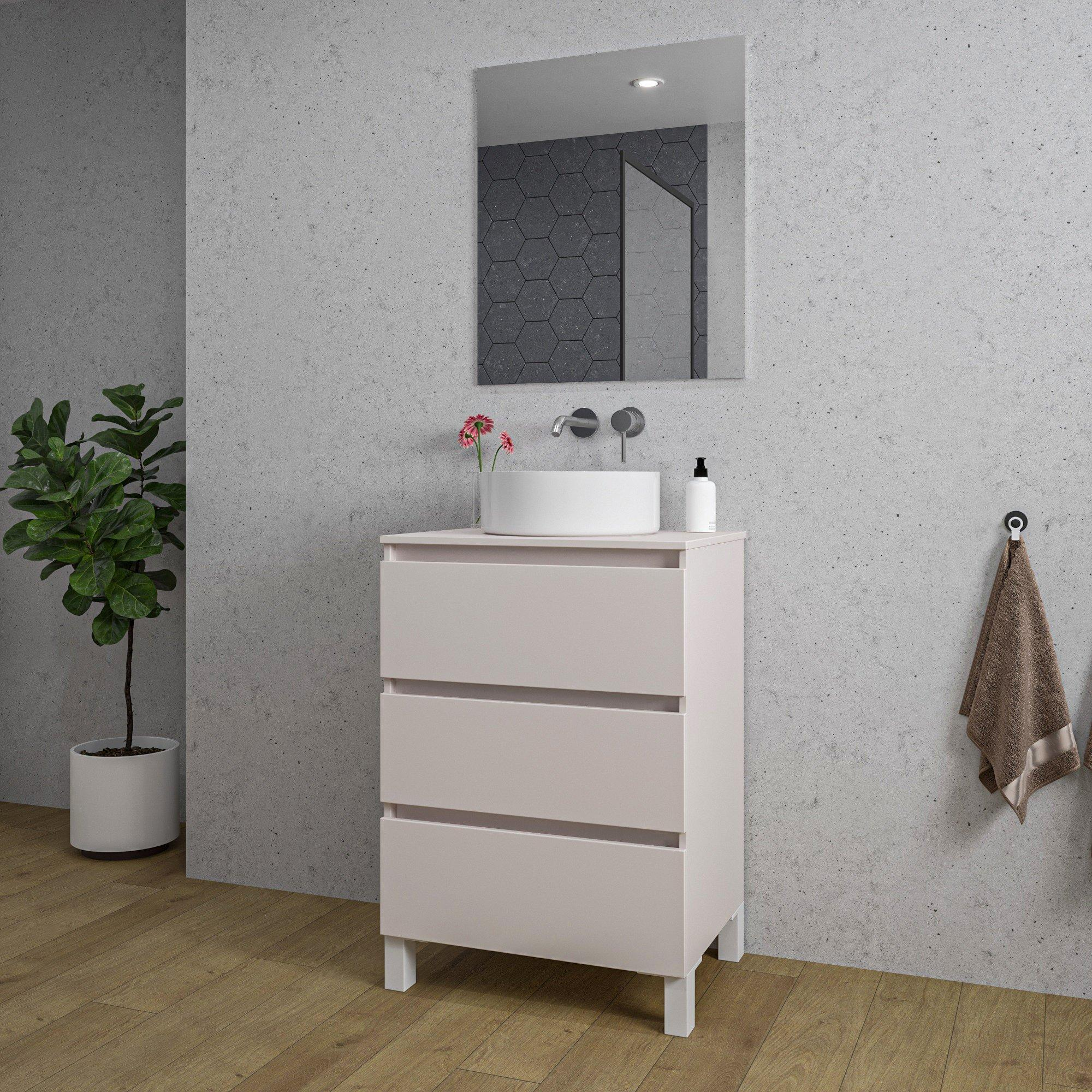 Saniclass Chaci PLUS Ensemble meuble de salle de bains - 60x86x46cm - vasque à poser - plan de toilette - 3 tiroirs - miroir rectangulaire - coton mat (beige)