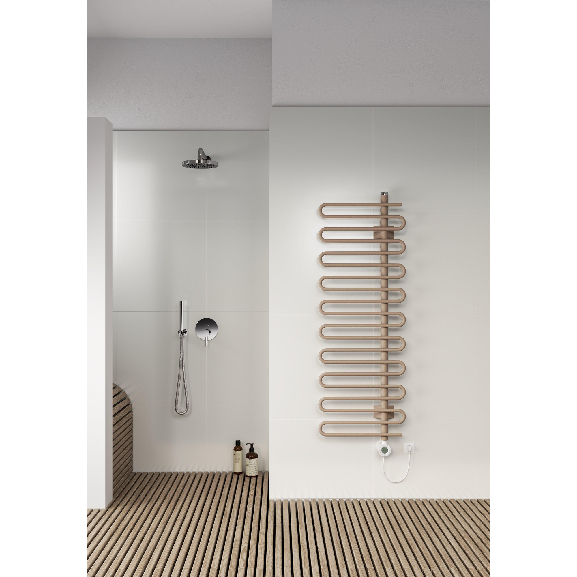 Le collecteur situé sur le côté gauche du radiateur, associé aux consoles murales, offre une installation facile et une grande flexibilité pour le positionnement du radiateur dans la salle de bains. La finition blanche standard s'harmonise sans effort avec différents styles d'intérieur et garantit une intégration parfaite dans la pièce.