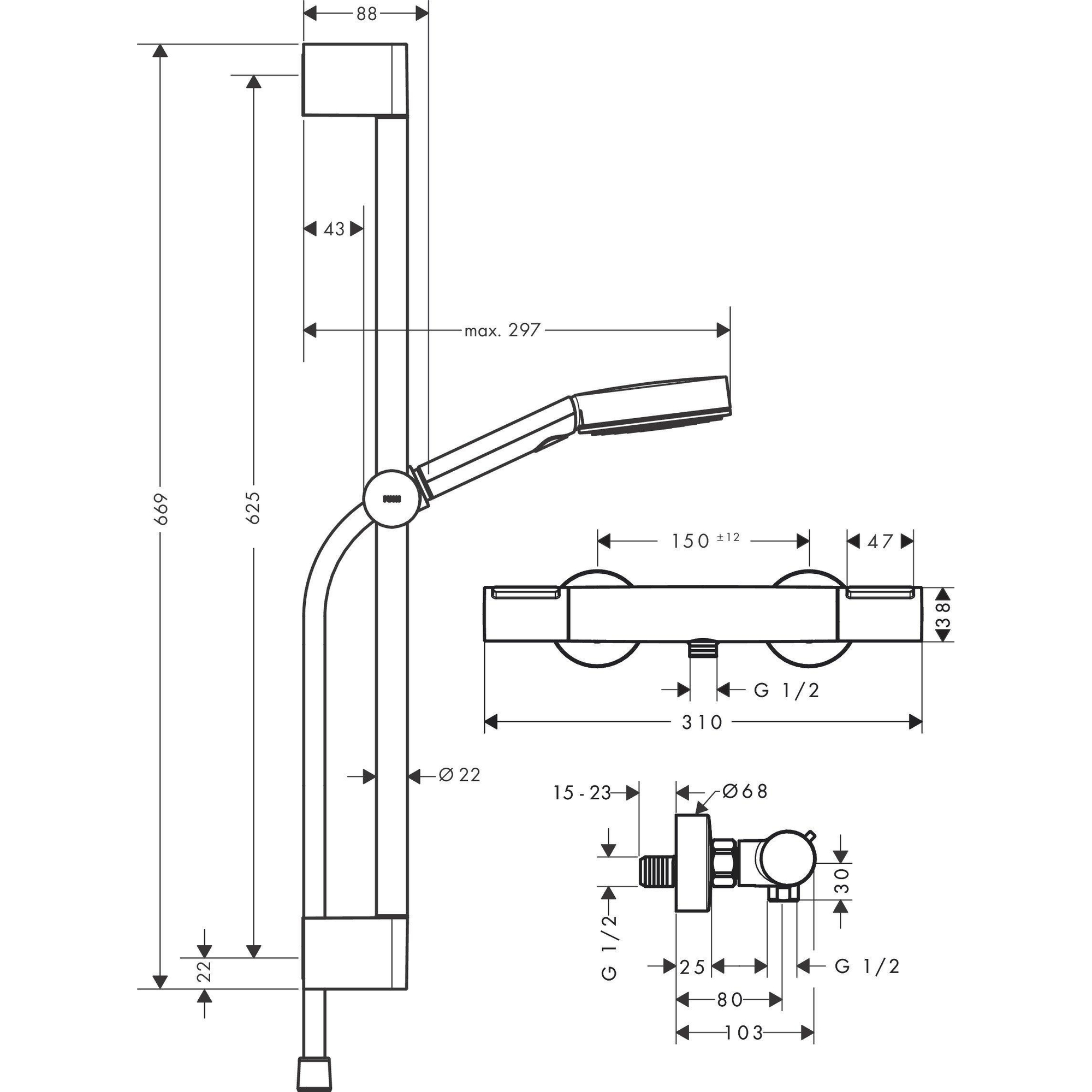 Hansgrohe Pulsify Select S Ensemble barre de douche - douchette - thermostat de douche - barre de douche - support coulissant - flexible de douche - barre chromée 65 cm - Chrome