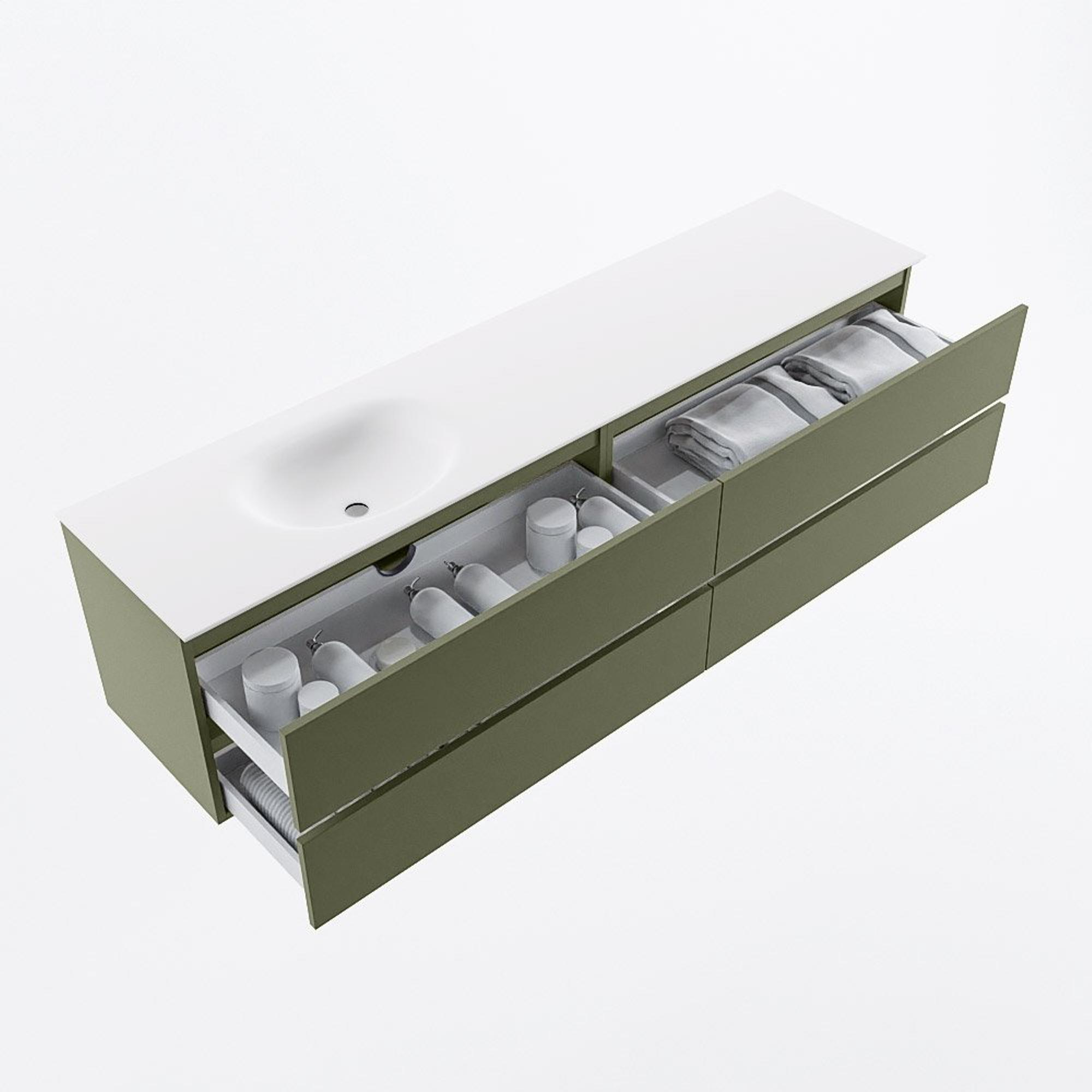L'ensemble de meubles de salle de bains Mondiaz VICA respire le luxe dans chaque détail. Le schéma de couleurs army et la finition de haute qualité donnent un sentiment d'élégance et de sophistication à votre salle de bains. Les 4 tiroirs n'offrent pas seulement suffisamment d'espace de rangement, mais sont également équipés de mécanismes de fermeture en douceur pour un confort et une facilité d'utilisation supplémentaires.