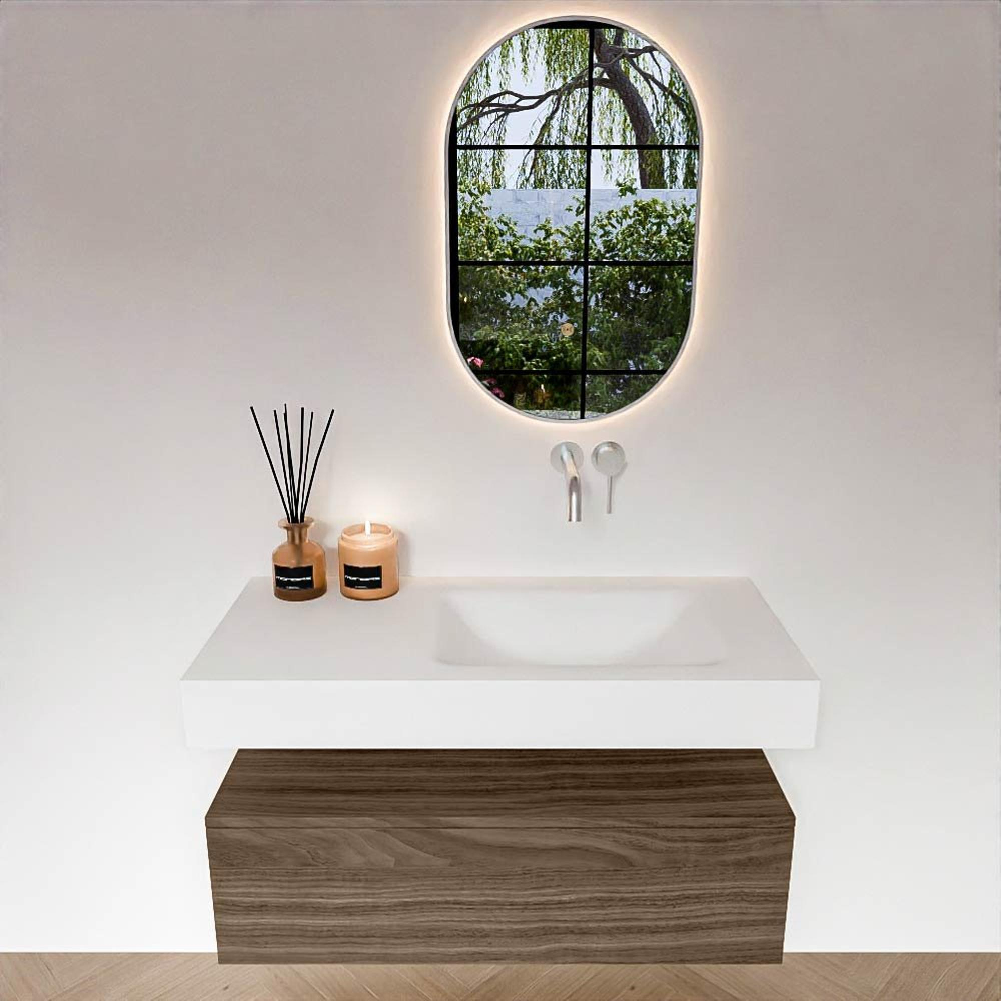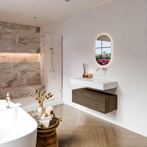 La combinaison de la couleur chaude Mocha avec la vasque subtile Talc donne à votre salle de bains une apparence contemporaine et raffinée. Le design organique de la vasque suspendue apporte une touche douce et naturelle qui inspire la sérénité. Ce meuble n'est pas seulement beau à voir, mais aussi un véritable point focal qui donne à votre salle de bains un aspect luxueux. Grâce à son design minimaliste, il s'intègre parfaitement dans les salles de bains modernes comme classiques. Ainsi, vous profitez d'un meuble intemporel qui dure des années sans se démoder.